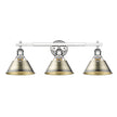 Bring vintage industrial elegance into your home with the Yep by Golden Lighting Orwell 3-light Vanity in Chrome. Featuring a metal shade and a polished chrome frame, it creates a welcoming atmosphere. The metal shade allows light to escape upwards, providing more ambient lighting for your space, while the aged brass finish on the shade distinguishes itself with a low-luster satin sheen and a fine, circular brushed texture that adds visual depth. The brilliant Polished Chrome finish offers a crisp, clean look, seamlessly integrating into a wide range of decor styles. This durable electroplating process creates an easy-to-clean surface that adds brightness to your home. Ideal for bathrooms, this light is Damp Location Rated, making it suitable for covered and semi-enclosed spaces with occasional moisture. It requires three E26 Medium base bulbs (not included), with a maximum wattage of 100 per bulb. Overall dimensions are 27.25"W x 9.88"H x 8.5"D. Enhance your space with quality design and functionality that brings both light and character to your decor.
