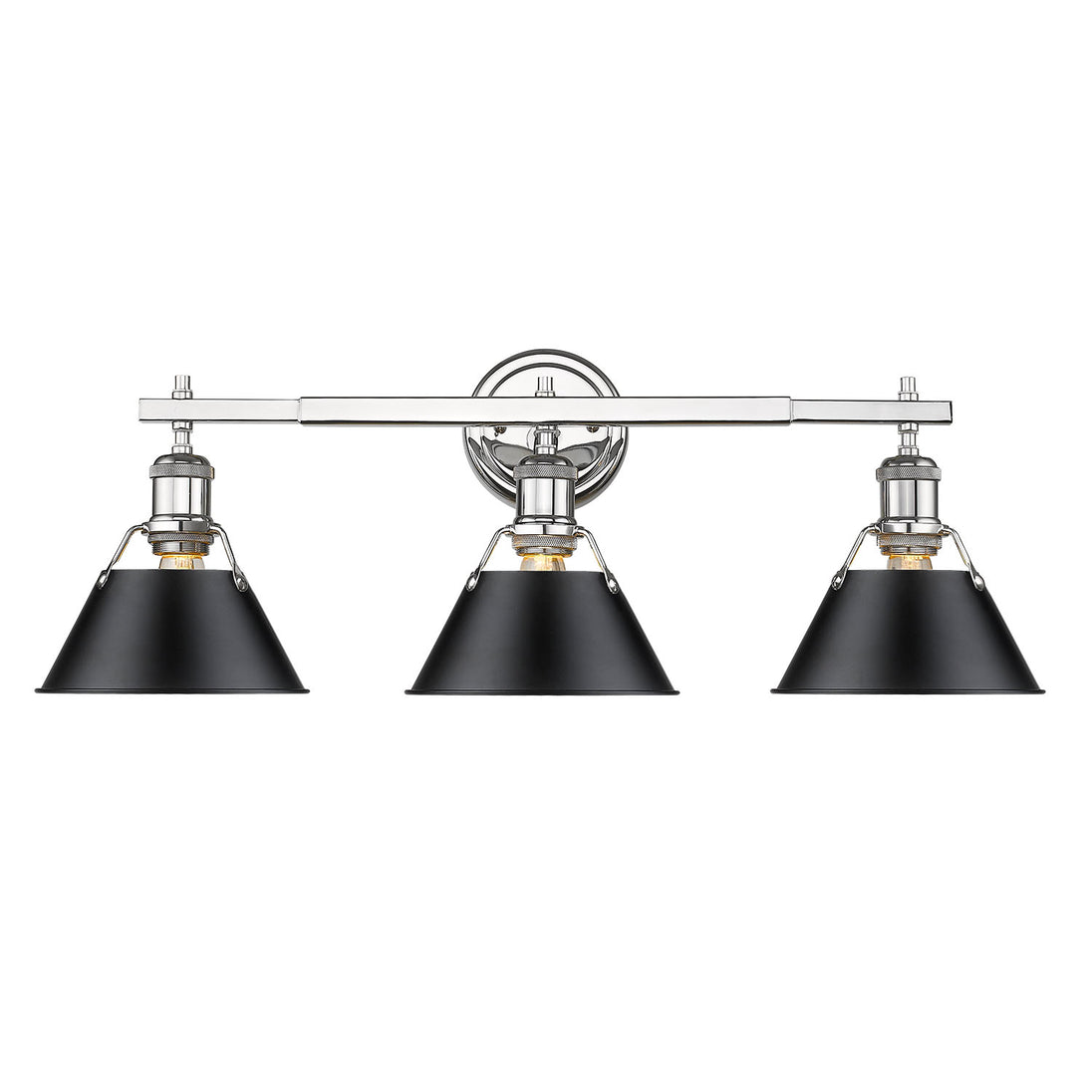 Bring industrial elegance into your home with the Yep by Golden Lighting Orwell 3-light Vanity. Featuring a metal shade and a brilliant Chrome frame, it creates a welcoming atmosphere in any bathroom. The metal shade complements the overall design, showcasing a classic Matte Black finish that absorbs light while providing a soft, sophisticated look. Its smooth surface enhances the fixture's clean modern aesthetic, ideal for any contemporary or vintage-inspired decor. The polished Chrome finish offers a crisp and clean look that's versatile, seamlessly integrating into a variety of styles. Its highly reflective, mirror-like surface adds a stunning gleam that brightens your space while remaining easy to clean. Designed for damp locations, this fixture is suitable for covered and semi-enclosed spaces with occasional moisture, such as bathrooms and laundry rooms. With overall dimensions of 27.25"W x 9.88"H x 8.5"D, it requires 3 E26 Medium base bulbs (not included), with a maximum wattage of 100 per bulb, ensuring ample illumination for your tasks. Close the gap between style and function with the Yep by Golden Lighting Orwell vanity light, your perfect addition to brighten up bathrooms while providing practical task illumination.