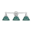Bring industrial elegance into your home with the Yep by Golden Lighting Orwell 3-light Vanity. Featuring a metal shade and a chrome frame, it creates a welcoming atmosphere. The pine green metal shade boasts a velvety matte finish, absorbing light and imparting a rich, saturated color. Brilliant and timeless, the polished chrome finish offers a crisp, clean look that easily integrates into diverse decor styles. Ideal for brightening bathrooms, this light provides flattering and practical task illumination. Rated for damp locations, it is suitable for covered and semi-enclosed spaces like bathrooms and laundry rooms. Requires 3 E26 Medium base bulbs (not included), each with a maximum wattage of 100, ensuring plenty of light for all your grooming needs. With overall dimensions of 27.25"W x 9.88"H x 8.5"D, this light fixture complements your vanity perfectly. Upgrade your bathroom with a blend of style and function.