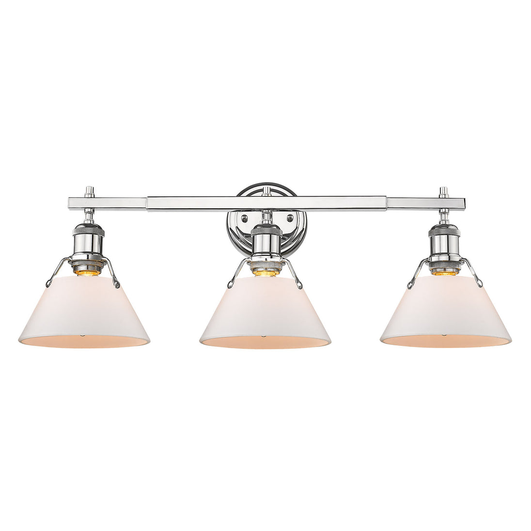 Bring industrial elegance into your home with the Yep by Golden Lighting Orwell 3-light Vanity. Featuring an opal glass shade and a polished Chrome frame, it creates a welcoming atmosphere. The opal glass shade is designed to diffuse light evenly for a soft, glare-free glow. This timeless and elegant shade provides a beautiful luminosity, perfectly diffusing light to create ambiance. The brilliant and timeless Polished Chrome finish offers a crisp, clean look that elevates any space, integrating seamlessly into a variety of decor styles. This finish is created using a durable electroplating process that is easy-to-clean, adding a touch of brightness and shine. Ideal for brightening up bathrooms with dedicated lighting that flatters, the vanity light is damp location rated, making it suitable for covered and semi-enclosed spaces. It requires 3 E26 Medium base bulbs (not included), with a maximum wattage of 100 per bulb, and has overall dimensions of 27.25"W x 9.88"H x 8.5"D. Close the door on dull lighting while enhancing your bathroom with this elegant, functional fixture.