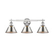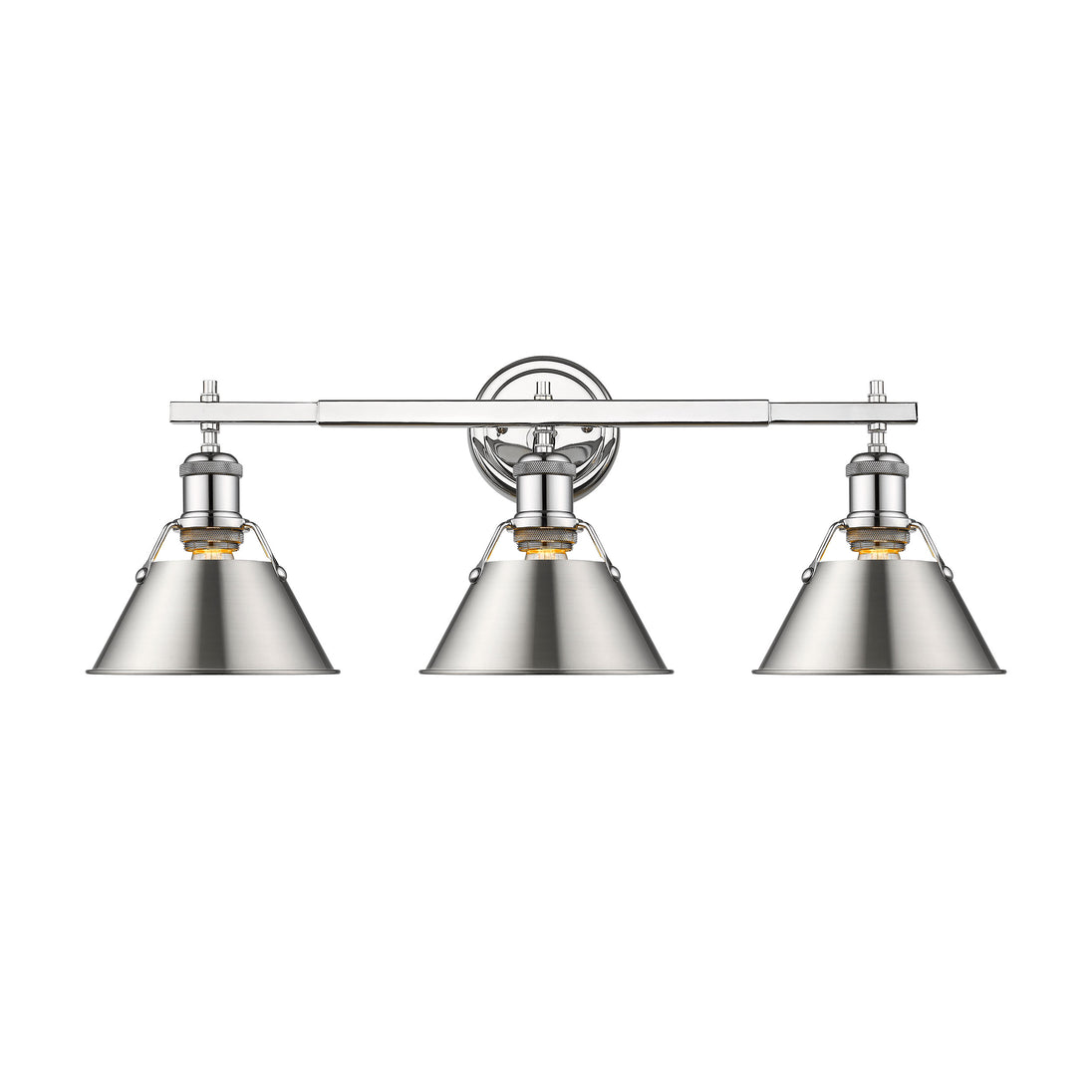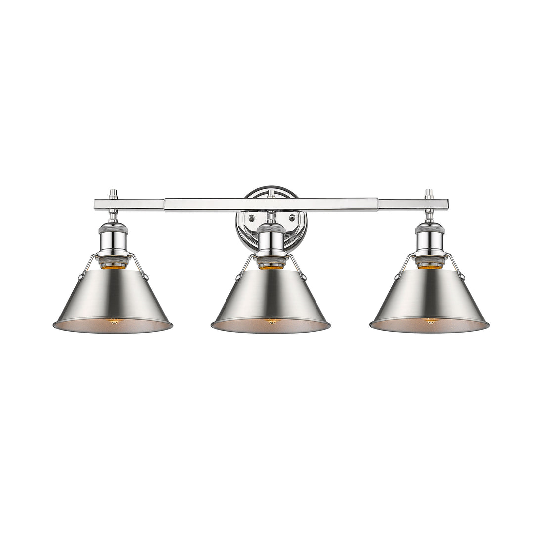 The Yep by Golden Lighting Orwell 3-light Vanity features an industrial design with a polished Chrome finish and pewter shade, creating an elegant ambiance in bathrooms.