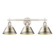 Bring industrial elegance into your home with the Yep by Golden Lighting Orwell 3-light Vanity. Featuring a metal shade and a pewter frame, it creates a welcoming atmosphere. The aged brass metal shade offers a low-luster satin sheen with a circular brushed texture that adds visual depth and character. This exquisite shade beautifully catches and diffuses light, evoking a sense of vintage charm. With a soft and classic pewter finish, it brings an understated appeal that complements both traditional and contemporary styles. The lighting fixture is damp location rated, making it suitable for covered and semi-enclosed spaces, including bathrooms and laundry rooms. Overall dimensions are 27.25"W x 9.88"H x 8.5"D, and it requires three E26 Medium base bulbs (not included) with a maximum wattage of 100 per bulb, providing ample illumination for your space. Transform your bathroom with the timeless design and quality of this vanity light, balancing style with functionality.