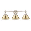 Bring industrial elegance into your home with the Yep by Golden Lighting Orwell 3-light Vanity. Featuring a metal shade and a pewter frame, it creates a welcoming atmosphere. The metal shade in Brushed Champagne Brass offers a pale, muted brassy-gold color with a refined brushed texture, lending a modern sophistication to your space. Our Pewter finish provides a soft and classic alternative to brighter silver tones, delivering an understated and timeless appeal. Brighten up bathrooms with dedicated lighting that flatters while providing practical task illumination. Damp Location Rated: Suitable for covered and semi-enclosed spaces like bathrooms, covered porches, and laundry rooms. Overall Dimensions: 27.25"W x 9.88"H x 8.5"D. Requires 3 E26 Medium base bulbs (not included), max 100 wattage per bulb. Elevate your bathroom with this quality fixture that seamlessly merges functionality with striking design.