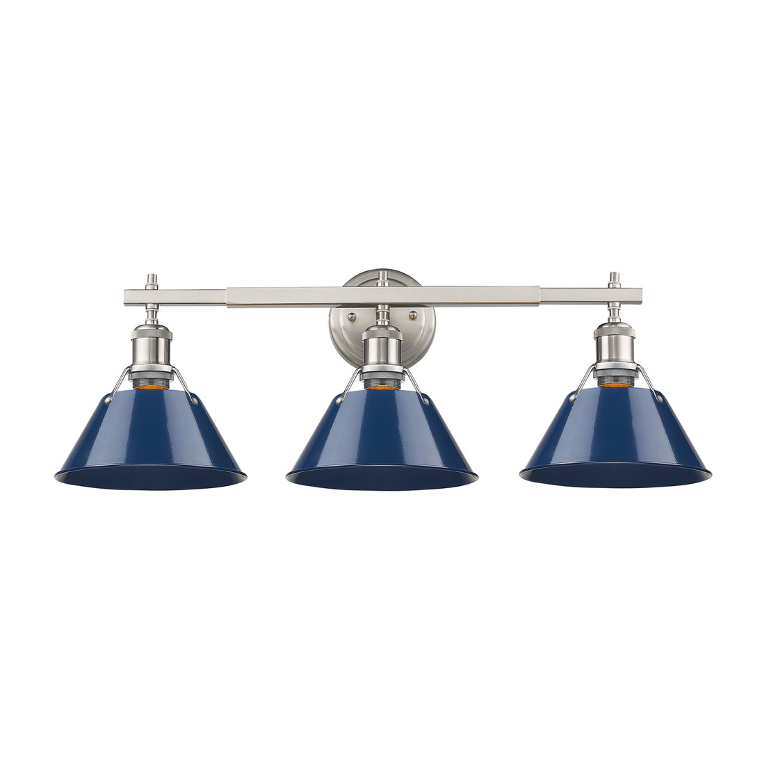 Bring industrial elegance into your home with the Yep by Golden Lighting Orwell 3-light Vanity. Featuring a stunning metal shade and a pewter frame, it creates a welcoming glow. The Navy Blue metal shade embodies classic nautical sophistication, reflecting light beautifully with its high-gloss finish and deep hue. Our Pewter finish offers a refined, timeless appeal, making this fixture well-suited for both contemporary and traditional spaces. It is damp location rated, suitable for bathrooms and areas with occasional moisture. This fixture requires three E26 medium base bulbs (not included), with a maximum wattage of 100 per bulb. Overall dimensions are 27.25"W x 9.88"H x 8.5"D. Experience the quality craftsmanship and design that enhance your home decor.