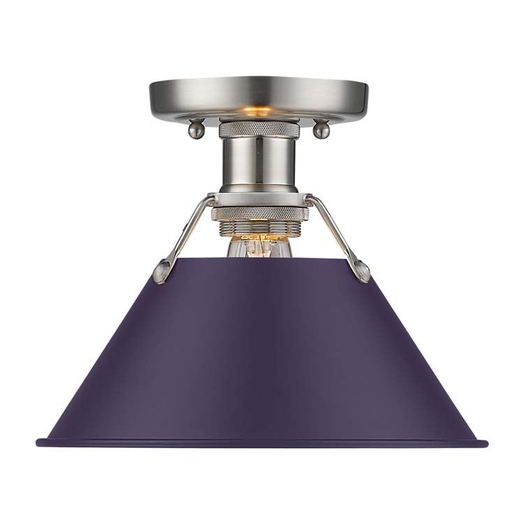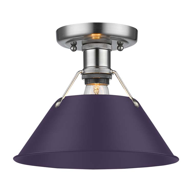 Bring industrial elegance into your home with the Yep by Golden Lighting Orwell 1-light Flush Mount. Featuring a metal shade and a pewter frame, it creates a welcoming atmosphere. The metal shade features an exotic purple finish with a deep, saturated hue, offering a bold statement. Its smooth, matte surface captures light beautifully, making it a perfect fit for contemporary interiors. Our pewter finish provides a timeless and soft alternative to brighter silver tones. The elegant satin luster gently diffuses light, creating an inviting glow without glare. Ideal for low ceilings in hallways, closets, bathrooms, and laundry areas, this fixture is damp location rated for spaces with occasional moisture. Overall Dimensions: 10"W x 8"H x 10"D. Requires 1 E26 Medium base bulb (not included), max 100 watts. Experience the blend of quality and style, adding a touch of high-fashion to any room.