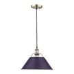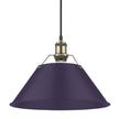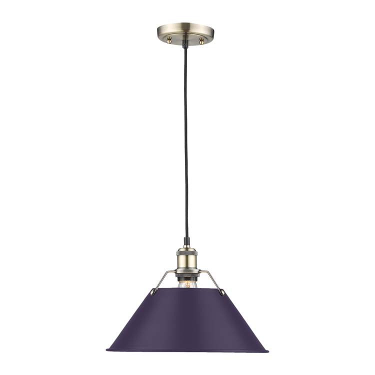 Bring industrial elegance into your home with the Yep by Golden Lighting Orwell 1-light 14in Pendant. Featuring a metal shade and a striking Aged Brass frame, it creates a welcoming atmosphere. The metal shade is adorned in an Exotic Purple finish, boasting a deep, saturated hue that enhances the dramatic effect of your lighting design. This luxurious color absorbs light beautifully, adding a modern and bold appeal. Embrace timeless elegance with the Aged Brass finish, which has a warm, inviting glow and showcases exquisite craftsmanship. This finish highlights the rugged aesthetic and supports the pendant's utilitarian identity. Add a stylish statement to kitchens, dining rooms, or bedrooms. This fixture is Damp Location Rated, making it suitable for moisture-prone areas. With Sloped-Ceiling Compatibility and an Adjustable Height, it adapts perfectly to your space. Overall dimensions are 14"W x 10"H x 14"D, and it requires 1 E26 Medium base bulb (not included) with a maximum wattage of 100. The Orwell pendant light serves as both functional illumination and a stunning accent piece, blending quality with high-fashion charm.