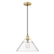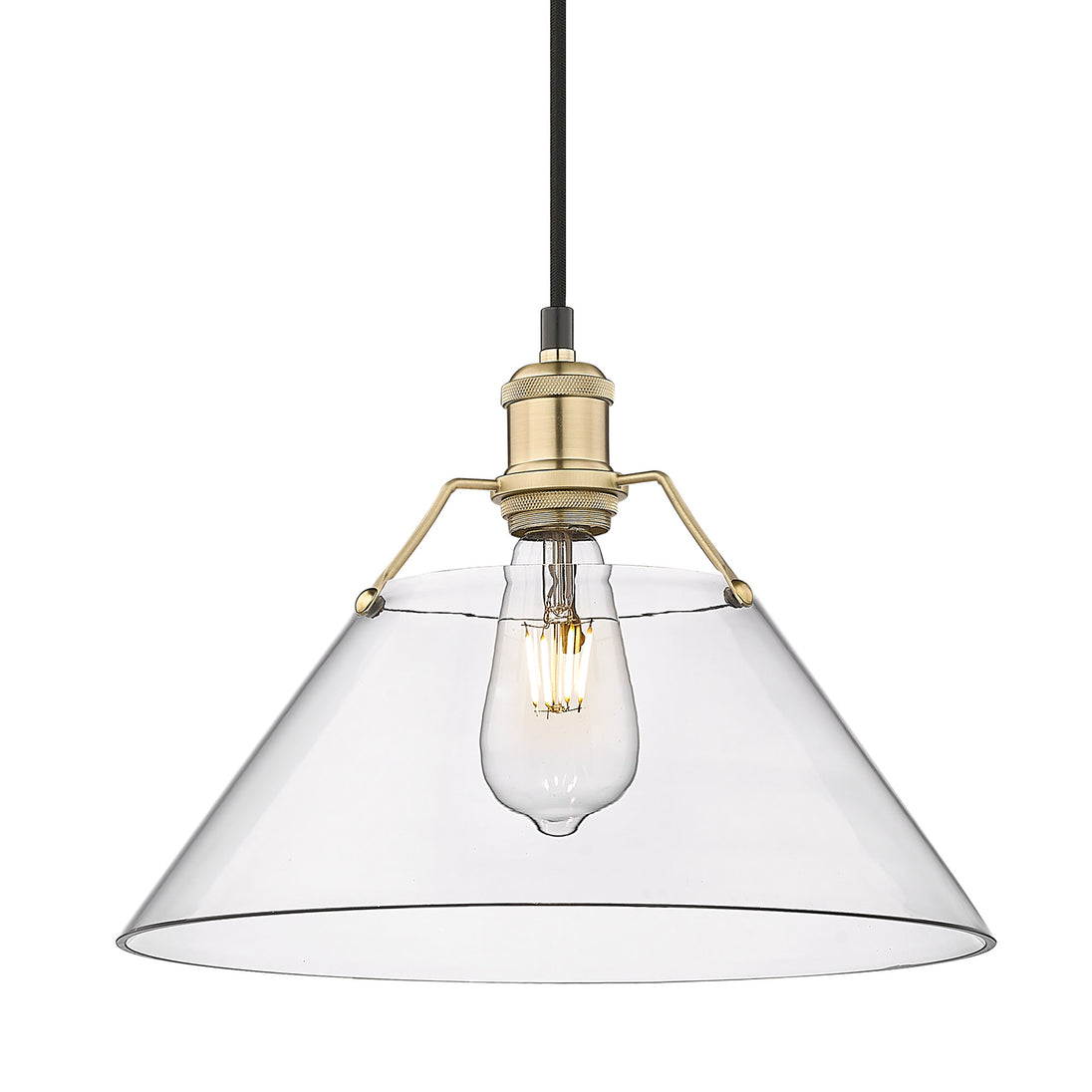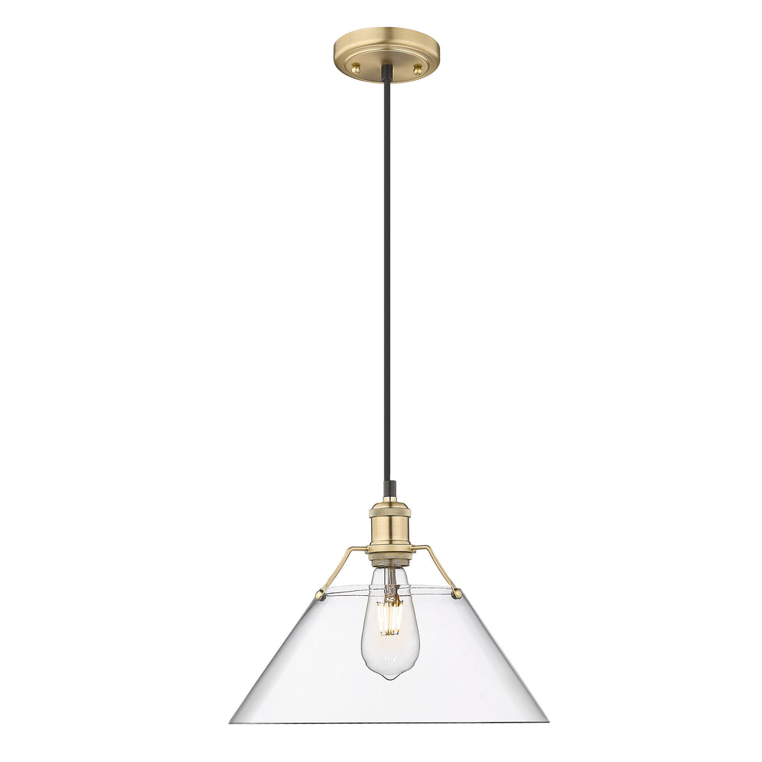 The Yep by Golden Lighting Orwell 1-light 14in Pendant showcases industrial elegance with a Brushed Champagne Brass finish and a clear glass shade, offering brilliant illumination in any space.