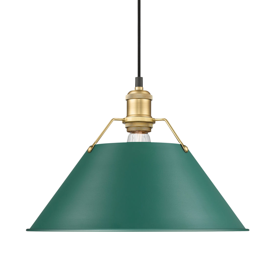 Bring industrial elegance into your home with the Yep by Golden Lighting Orwell 1-light 14in Pendant. Featuring a metal shade and a Brushed Champagne Brass frame, it creates a welcoming atmosphere. The metal shade in Pine Green showcases a smooth surface with a matte sheen, offering a rich touch of color that enhances the light effect beautifully. The Brushed Champagne Brass finish blends the warmth of brass with the softness of silver, adding a chic, versatile color to your interior design. Perfect for kitchens, dining rooms, or bedrooms, this fixture is damp location rated, making it suitable for covered spaces. It is also sloped-ceiling compatible with an adjustable height ranging from 17.5" to 131.5", ensuring a custom fit for your space. Overall dimensions of 14"W x 10"H x 14"D require 1 E26 Medium base bulb (not included) with a maximum wattage of 100. Elevate your home with this stylish and quality pendant light, crafted to create lasting impact and ambiance.