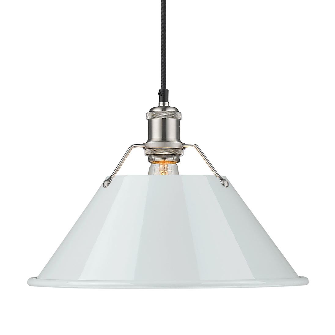 The Yep by Golden Lighting Orwell 1-light 14in Pendant combines industrial design with pewter and a dusky blue metal shade, creating a serene illumination that elevates kitchens and dining rooms.