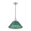 Bring industrial elegance into your home with the Yep by Golden Lighting Orwell 1-light 14in Pendant. Featuring a metal shade and a pewter frame, it creates a welcoming atmosphere. The metal shade is adorned with a Pine Green finish, showcasing rich, saturated green tones that absorb light beautifully, adding a botanical touch to your space. Our Pewter finish offers a sophisticated, classic alternative to brighter silver tones, with a satin luster that diffuses light gently. Ideal for kitchens, dining rooms, or bedrooms, this pendant is Damp Location Rated for covered spaces and is Sloped-Ceiling Compatible with an adjustable height from 17.5" to 131.5". Overall Dimensions: 14"W x 10"H x 14"D. Requires 1 E26 Medium base bulb (not included, max 100 wattage). Elevate your home decor with this stylish pendant light that offers both quality and elegance.