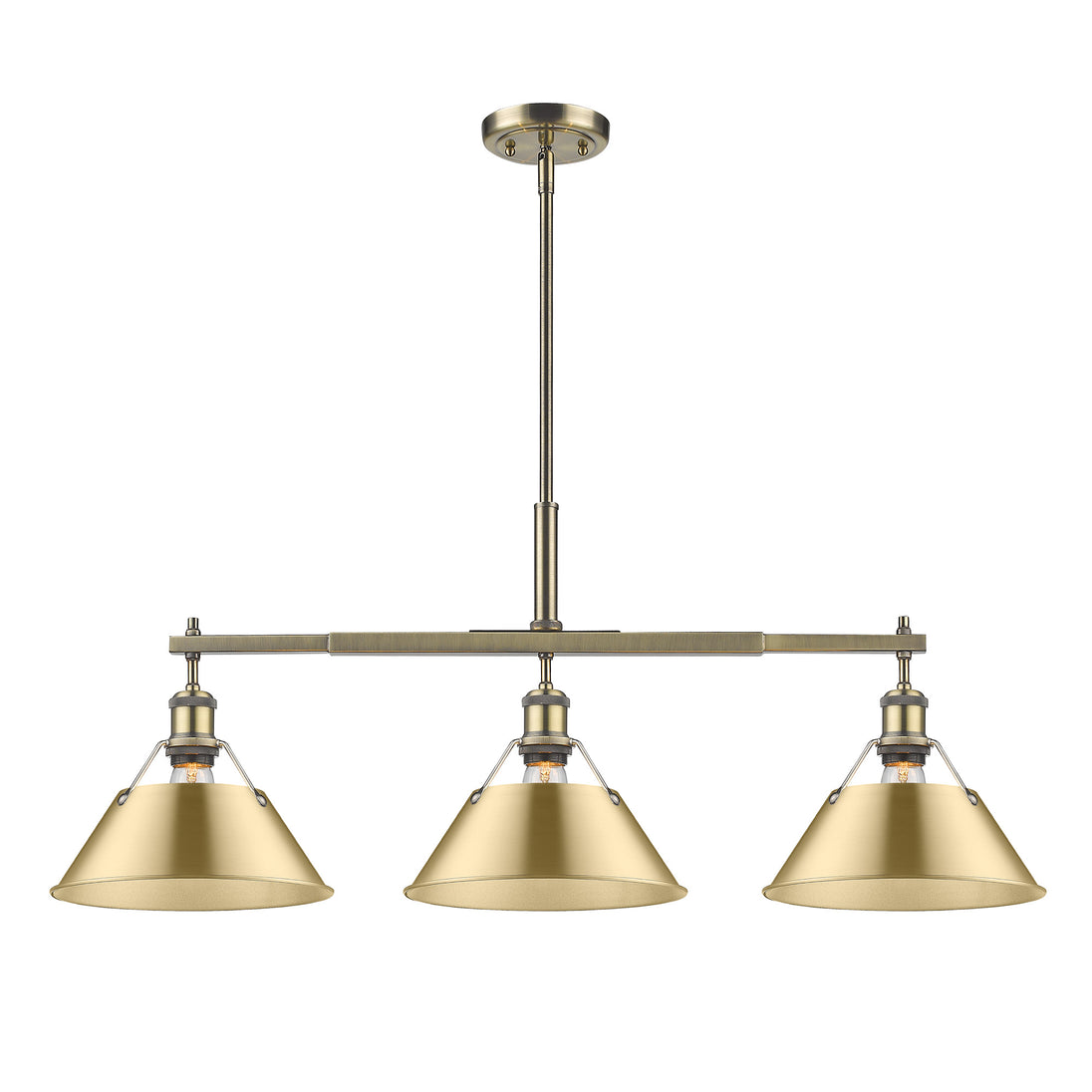 The Yep by Golden Lighting Orwell 3-light Island Light combines industrial charm with Aged Brass and a metal shade, creating an inviting light that enhances kitchen islands.