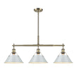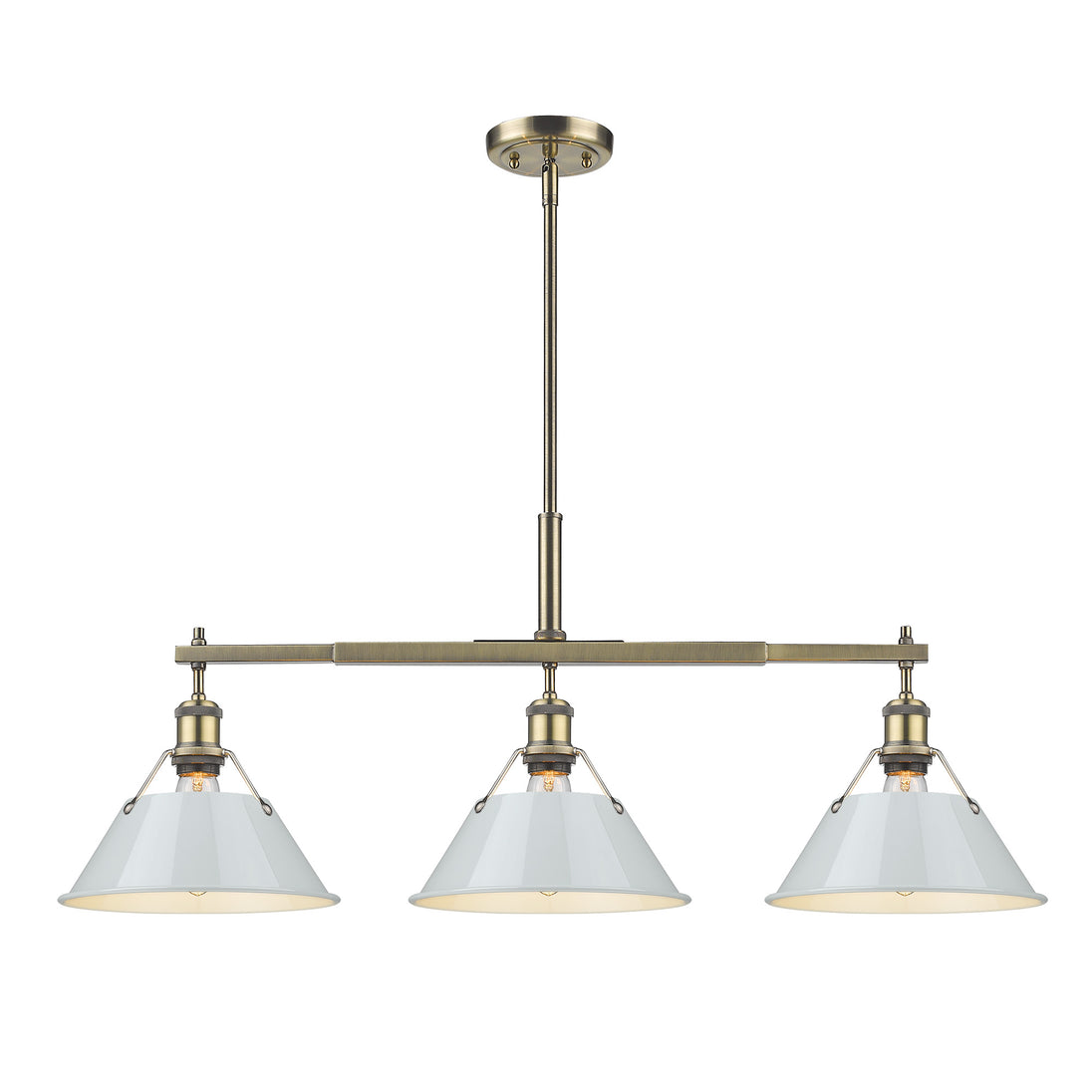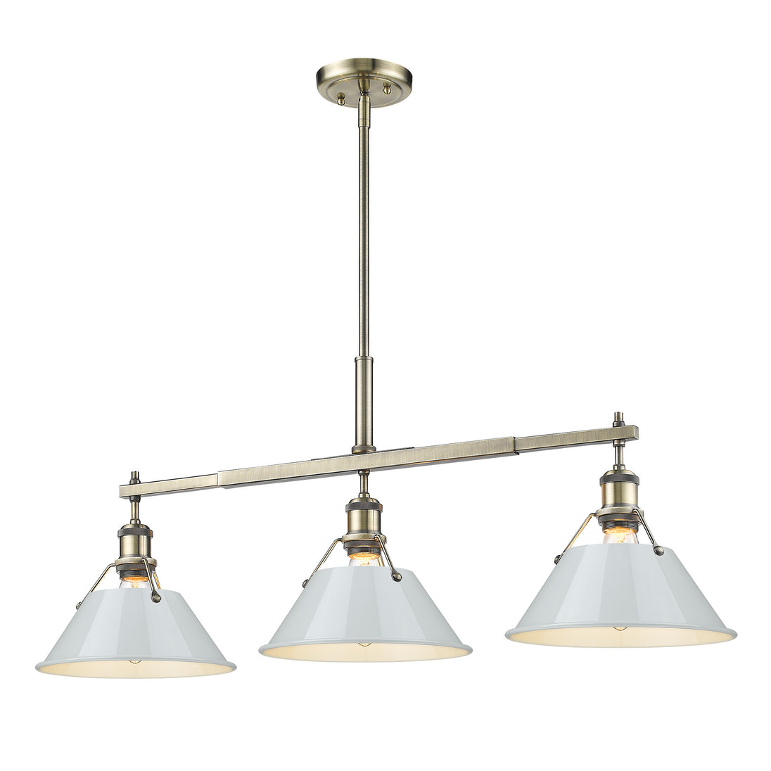 Bring industrial elegance into your home with the Yep by Golden Lighting Orwell 3-light Island Light. Featuring a Dusky Blue metal shade and a sophisticated Aged Brass frame, it creates a welcoming atmosphere. The metal shade offers a serene, sophisticated touch of color, while its glossy finish enhances the light effect beautifully, creating both ambient and functional lighting in your space. Embrace timeless elegance with our Aged Brass finish that offers a warm, inviting glow, reminiscent of vintage heirlooms and classic hardware. This finish adds understated luxury and character to your room. Tailored for kitchen islands with a Dry Location Rating, it’s perfect for indoor spaces not subject to moisture. Installation is effortless thanks to its sloped-ceiling compatibility, and the adjustable height ranges from 17.125" to 59.125". Overall dimensions are 35.75"W x 14.5"H x 10"D, and it requires 3 E26 Medium base bulbs (not included), with a maximum wattage of 100 per bulb. Elevate your living space with a fixture that seamlessly combines functionality and style, perfectly suited for gatherings and everyday use.