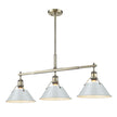 The Yep by Golden Lighting Orwell 3-light Island Light features a unique design with Aged Brass and a Dusky Blue metal shade, bringing a serene touch to your kitchen islands.
