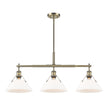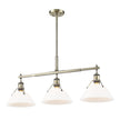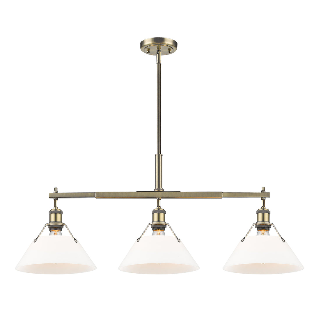 Bring industrial elegance into your home with the Yep by Golden Lighting Orwell 3-light Island Light. Featuring an opal glass shade and an Aged Brass frame, it creates a soft atmosphere. The opal glass shade provides a milky, translucent white effect with a satin-matte finish, perfectly diffusing light for a soft, glare-free glow—ideal for crafting an inviting kitchen environment. Embrace timeless elegance with our Aged Brass finish, created through a durable electroplating process that beautifully catches and diffuses light. This sophisticated finish adds a touch of understated luxury to your decor. Perfect for tailored kitchen islands, this fixture is Dry Location Rated, ensuring safety in indoor spaces free from moisture. The Sloped-Ceiling Compatible design allows easy installation on angled ceilings, while the Adjustable Height feature ranges from 17.125" to 59.125" to accommodate varying ceiling heights. With overall dimensions of 35.75"W x 14.5"H x 10"D, the light requires 3 E26 Medium base bulbs (not included) with a maximum wattage of 100 per bulb. Enhance your kitchen with functional style and quality, providing a beautiful ambiance for gatherings.
