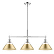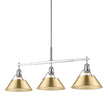 Bring industrial elegance into your home with the Yep by Golden Lighting Orwell 3-light Island Light. Featuring a metal shade and a chrome frame, it creates a welcoming atmosphere. The brushed champagne brass texture beautifully complements the light, offering a modern sophistication that catches the eye. Brilliant and timeless, the Polished Chrome finish provides a durable and easy-to-clean surface, adding brightness and style to any décor. Tailored for kitchen islands, this fixture is Dry Location Rated, ensuring safety for indoor settings without moisture. It is also sloped-ceiling compatible and adjustable in height, ranging from 17.125" to 59.125". Overall dimensions are 35.75"W x 14.5"H x 10"D, requiring 3 E26 Medium base bulbs (not included, max 100 wattage per bulb). Ideal for creating a chic atmosphere, this light fixture embodies quality and transformation for your interior space.