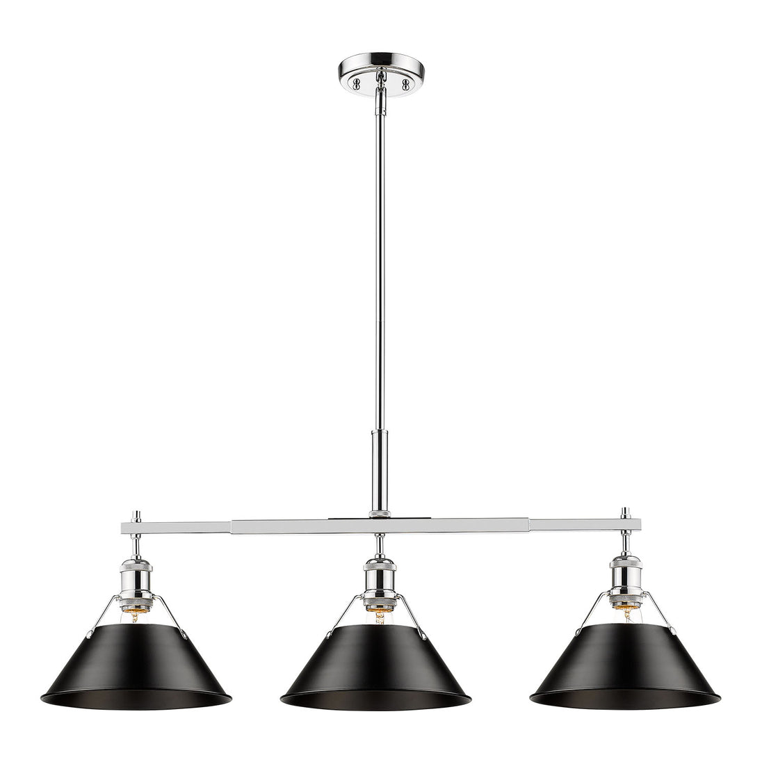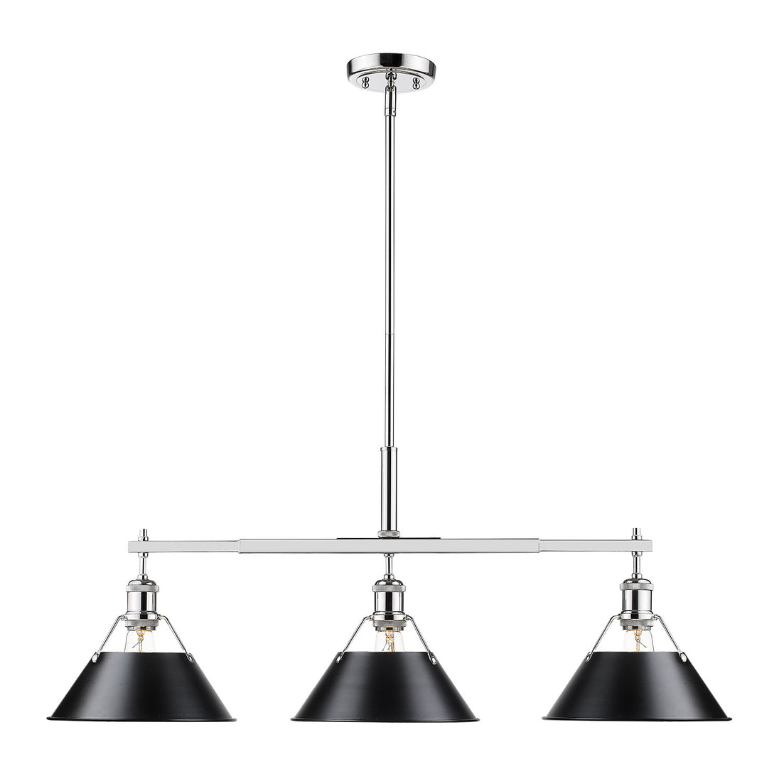 Bring industrial elegance into your home with the Yep by Golden Lighting Orwell 3-light Island Light. Featuring a metal shade and a chrome frame, it creates a welcoming atmosphere. The matte black texture provides a sophisticated contrast that enhances the overall aesthetic. Brilliant and timeless, the Polished Chrome finish provides a durable and easy-to-clean surface, adding brightness and style to any décor. Tailored for kitchen islands, this fixture is Dry Location Rated, ensuring safety for indoor settings without moisture. It is also sloped-ceiling compatible and adjustable in height, ranging from 17.125" to 59.125". Overall dimensions are 35.75"W x 14.5"H x 10"D, requiring 3 E26 Medium base bulbs (not included, max 100 wattage per bulb). Ideal for creating a chic atmosphere, this light fixture embodies quality and transformation for your interior space.