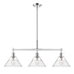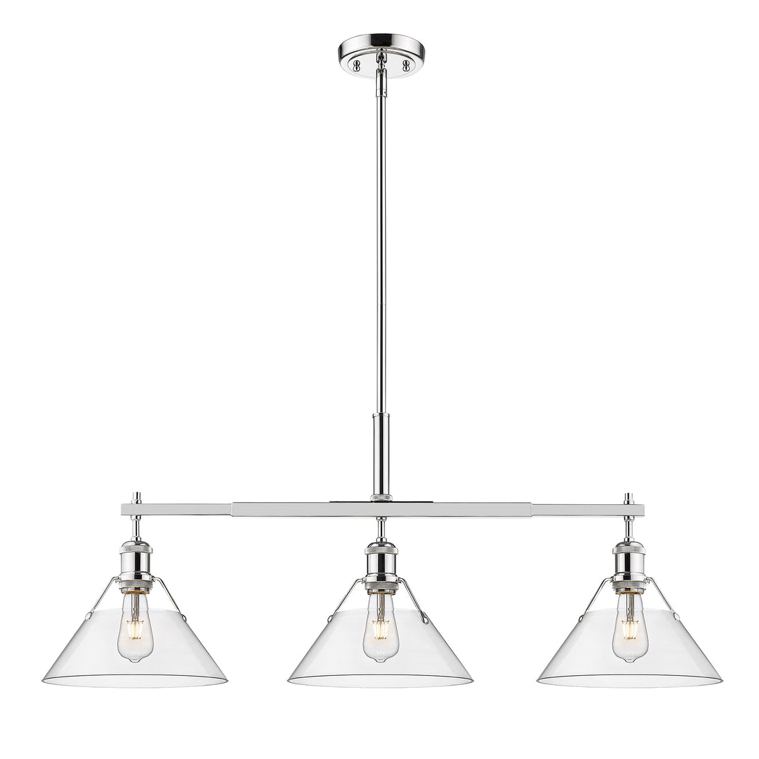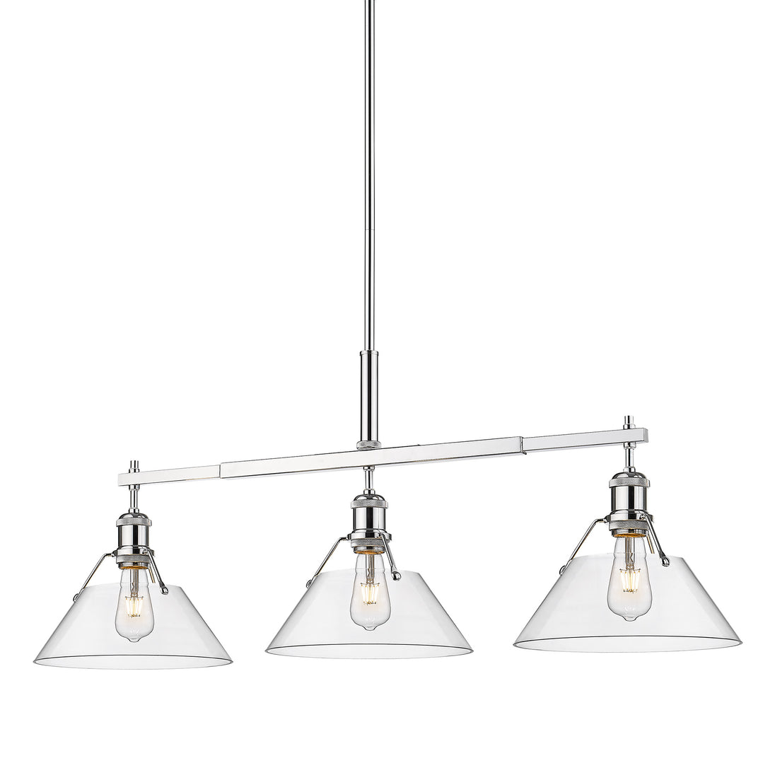 Bring industrial elegance into your home with the Yep by Golden Lighting Orwell 3-light Island Light. Featuring a glass shade and a chrome frame, it creates a welcoming atmosphere. The clear glass shade offers brilliant, unobstructed light, showcasing the beauty of the bulb and fixture design. Our Polished Chrome finish ensures a crisp, clean look that integrates effortlessly into modern and traditional decor styles. Tailored for kitchen islands, this light is dry location rated, making it ideal for indoor spaces. Its sloped-ceiling compatibility and adjustable height from 17.125" to 59.125" allow customization to suit your space. Overall dimensions measure 35.75"W x 14.5"H x 10"D, and it requires 3 E26 Medium base bulbs (not included), with a maximum wattage of 100 per bulb. Ideal for creating a vibrant and functional atmosphere, this piece makes a statement in any home.