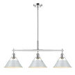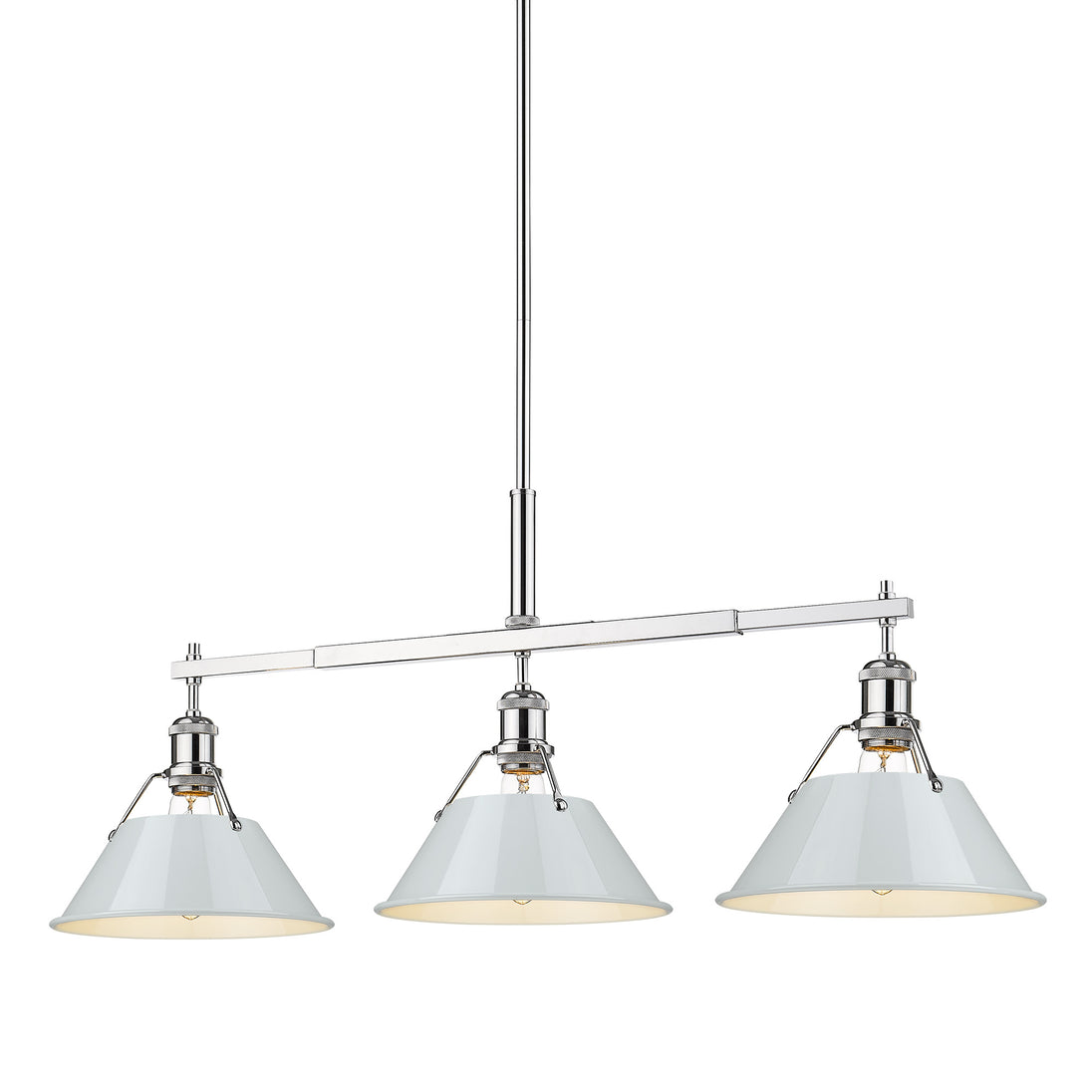 Bring industrial elegance into your home with the Yep by Golden Lighting Orwell 3-light Island Light. Featuring a dusky blue shade and a chrome frame, it creates a welcoming atmosphere. The dusky blue metal shade offers a serene and sophisticated touch of color, reminiscent of vintage enamelware. Our Polished Chrome finish ensures a crisp, clean look that integrates effortlessly into modern and traditional decor styles. Tailored for kitchen islands, this light is dry location rated, making it ideal for indoor spaces. Its sloped-ceiling compatibility and adjustable height from 17.125" to 59.125" allow customization to suit your space. Overall dimensions measure 35.75"W x 14.5"H x 10"D, and it requires 3 E26 Medium base bulbs (not included), with a maximum wattage of 100 per bulb. Ideal for creating a calming atmosphere, this piece makes a lasting impression in any home.