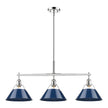 Bring industrial elegance into your home with the Yep by Golden Lighting Orwell 3-light Island Light. Featuring a metal shade and a polished chrome frame, it creates a welcoming atmosphere. The Navy Blue metal shade offers a rich, deep color with a high-gloss sheen that provides a bold presence, perfect for the modern kitchen. The finish adds a sophisticated shine while easily integrating into various interior styles. Rated for dry locations, this fixture is ideal for kitchens, dining areas, and hallways. Easy to install and adjustable in height, it requires 3 E26 medium base bulbs (max 100 watts each). Overall dimensions measure 35.75"W x 14.5"H x 10"D, making it an excellent choice for striking accent lighting.