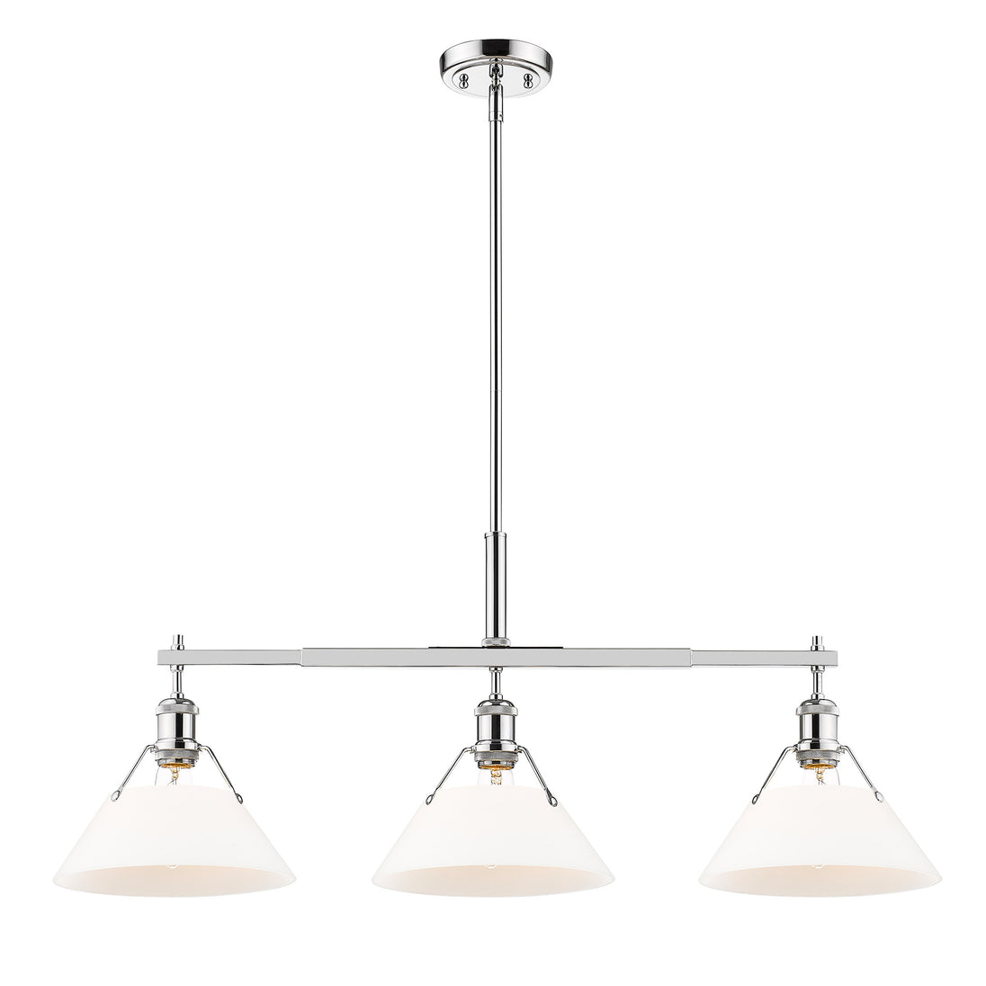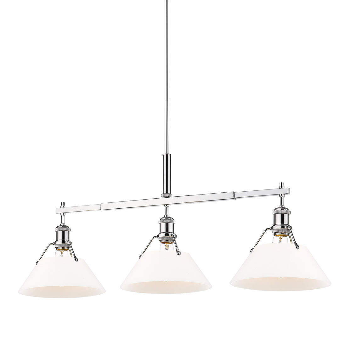 Bring industrial elegance into your home with the Yep by Golden Lighting Orwell 3-light Island Light. Featuring a glass shade and a chrome frame, it creates a welcoming atmosphere. The opal glass shade provides a smooth, satin-matte finish that diffuses light evenly for a soft, glare-free glow. The brilliant and timeless Polished Chrome finish offers a sleek, reflective surface, adding brightness and polished perfection to any space. Tailored for kitchen islands, this fixture is Dry Location Rated, making it ideal for indoor spaces like bedrooms, living rooms, and hallways. It is also sloped-ceiling compatible and has an adjustable height of 17.125" to 59.125". Overall dimensions are 35.75"W x 14.5"H x 10"D, requiring 3 E26 Medium base bulbs (not included) with a maximum wattage of 100 per bulb. Close with style and quality, this light fixture suits various modern decors.