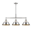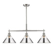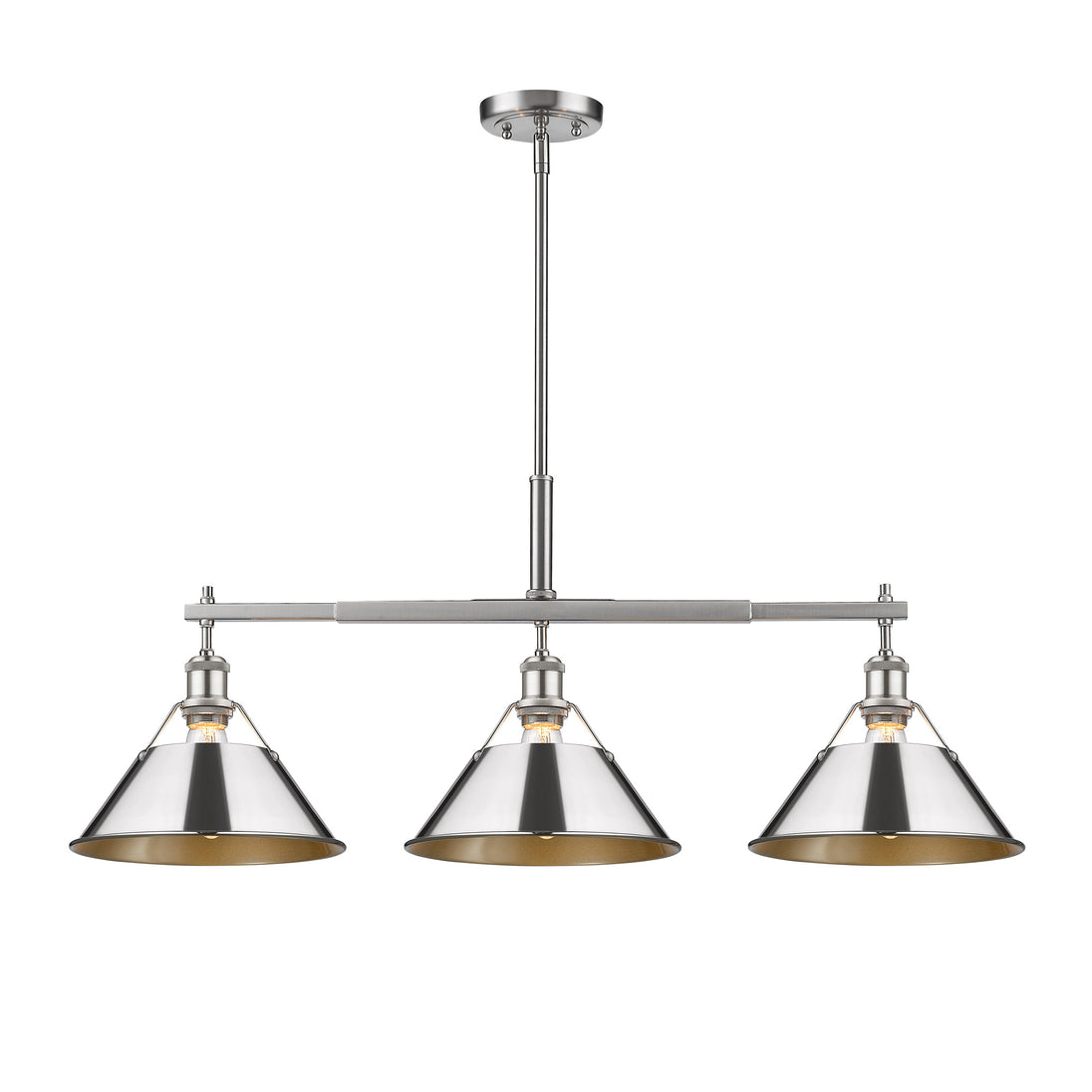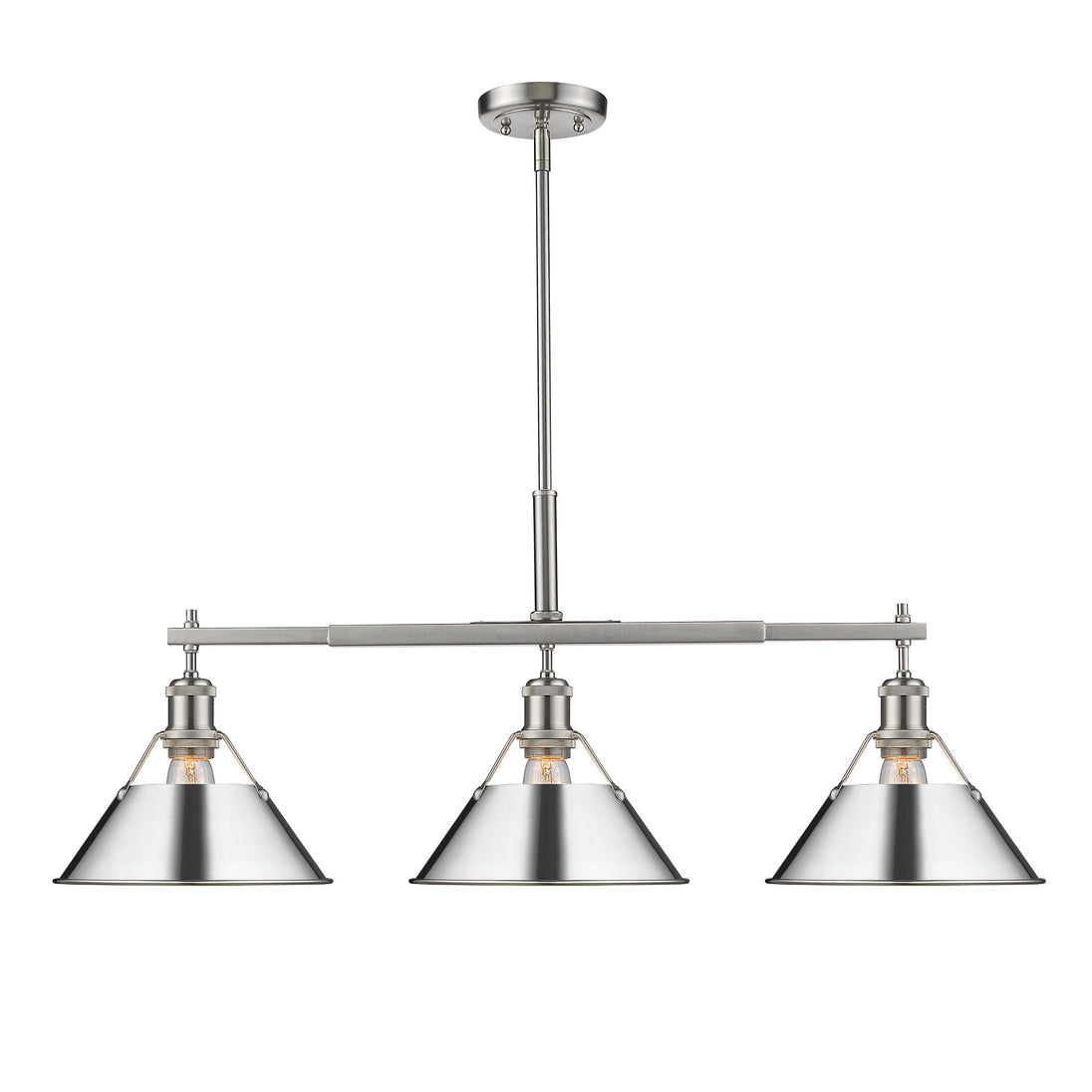 Bring industrial sophistication into your home with the Yep by Golden Lighting Orwell 3-light Island Light. Featuring a metal shade and a pewter frame, it creates a welcoming and stylish atmosphere. The metal shade in polished chrome boasts a highly reflective surface with a bright, cool-toned silver finish, adding a sleek element that catches the eye and elevates any interior decor. Our Pewter finish enhances this fixture’s elegance with its medium-grey hue that diffuses light gently, creating a sophisticated, non-glare effect ideal for various settings. This fixture is tailored for kitchen islands, dry location rated for indoor use, and easily installed on sloped ceilings with an adjustable height from 17.125" to 59.125". It requires 3 E26 medium base bulbs (not included), ensuring bright and functional lighting. With overall dimensions of 35.75"W x 14.5"H x 10"D, it beautifully balances functionality with style. Elevate your home with an exquisite blend of industrial style, robustness, and timeless design, ensuring your space feels both modern and inviting.