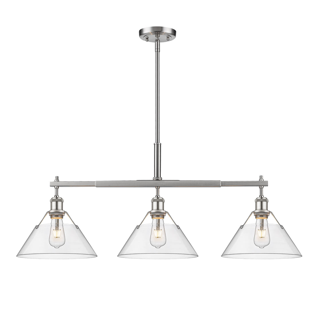 Bring industrial elegance into your home with the Yep by Golden Lighting Orwell 3-light Island Light. Featuring a clear glass shade and a pewter frame, it creates a welcoming atmosphere. The clear glass shade offers brilliant, unobstructed light and a glossy finish, ensuring the beauty of the bulbs and fixture's design take center stage. Its polished surface complements a variety of styles, from modern farmhouse to minimalist, making it ideal for spaces where vibrant illumination is desired. With a pewter finish that provides a soft, classic alternative to brighter silver tones, this fixture brings timeless appeal to your decor. The durable electroplating process gives the surface a satin lustre that gently diffuses light, creating an elegant glow. Tailored for kitchen islands, this fixture is dry location rated, making it ideal for indoor spaces free from moisture. Installation is a breeze with the sloped-ceiling compatibility and adjustable height feature, allowing customization to suit your space, with a hanging length ranging from 17.125" to 59.125". Overall dimensions of the fixture are 35.75"W x 14.5"H x 10"D, and it requires three E26 Medium base bulbs (not included), with a maximum wattage of 100 per bulb. Elevate your home with this stylish lighting solution for any culinary environment, combining functionality with aesthetic quality.
