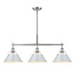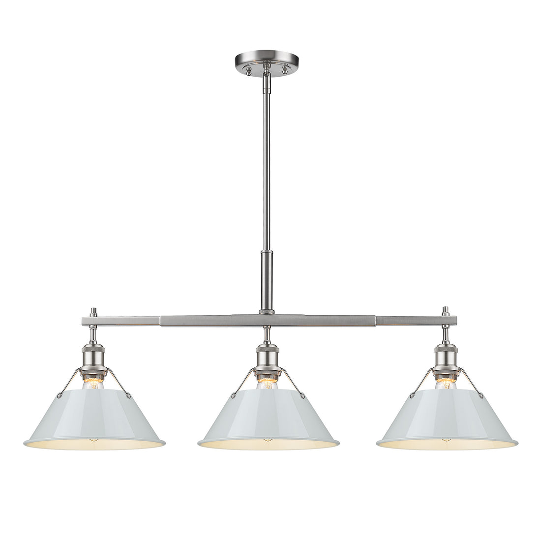 Bring industrial elegance into your home with the Yep by Golden Lighting Orwell 3-light Island Light. Featuring a metal shade and a pewter frame, it creates a welcoming atmosphere. The metal shade showcases a Dusky Blue finish, providing a muted, soft light blue color that enhances the aesthetic. The shade's high-gloss sheen offers a smooth surface, diffusing light beautifully for a serene ambiance. Our Pewter finish offers a soft and classic alternative to brighter silver tones, imparting an understated and timeless appeal that fits seamlessly within both classic and modern interiors. Tailored for kitchen islands, this fixture is ideal for dry locations like bedrooms and living rooms. Easily install it on sloped ceilings with the adjustable height feature ranging from 17.125" to 59.125". Overall dimensions are 35.75"W x 14.5"H x 10"D, and it requires three E26 medium base bulbs (not included), with a maximum wattage of 100 per bulb. Experience quality craftsmanship with the Yep by Golden Lighting, a fresh addition to your home decor.