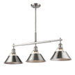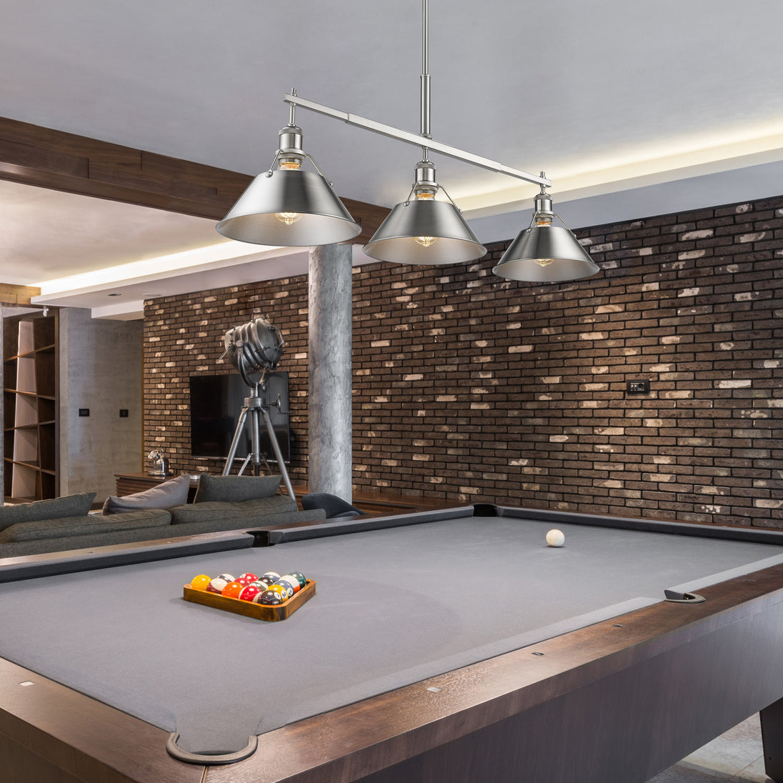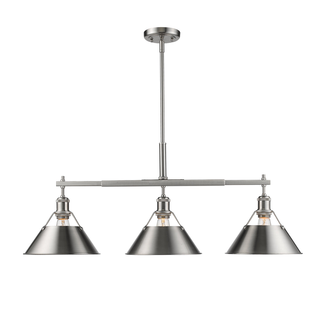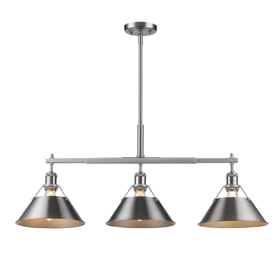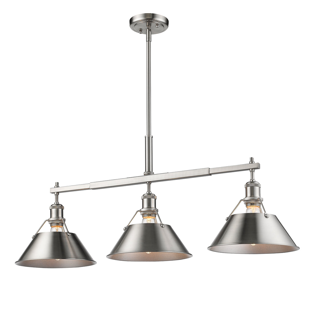 Bring industrial elegance into your home with the Yep by Golden Lighting Orwell 3-light Island Light in Pewter. Featuring a metal shade and a pewter frame, it creates a welcoming atmosphere. The pewter metal shade features a warm silver-grey color with a brushed texture that enhances the light diffusion, creating an elegant, non-glare glow. Our Pewter finish offers a soft and classic alternative to brighter silver tones, bringing understated and timeless appeal to your space. This versatile choice suits both classic and contemporary interiors. Tailored for kitchen islands, this fixture is dry location rated, ideal for indoor spaces not subject to moisture. It is sloped-ceiling compatible and adjustable in height from 17.125" to 59.125", allowing you to customize the hanging length to suit your space. Overall Dimensions: 35.75"W x 14.5"H x 10"D. Requires 3 E26 Medium base bulbs (not included), with a maximum wattage of 100 per bulb. Elevate your kitchen with this stylish and functional lighting solution, offering quality and aesthetic appeal.