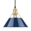 Bring industrial elegance into your home with the Yep by Golden Lighting Orwell 1-light 10in Pendant. Featuring a metal shade and a Brushed Champagne Brass frame, it creates a welcoming atmosphere. The navy blue metal shade offers a bold, sophisticated pop of color, reminiscent of timeless nautical style, while reflecting light beautifully. The brushed champagne brass finish is the epitome of modern sophistication, blending warmth with a soft satin sheen that highlights any space. Perfect for kitchens, dining rooms, or bedrooms, this pendant light is Damp Location Rated and suitable for covered and semi-enclosed spaces like bathrooms and porches. The installation is easy with sloped-ceiling compatibility and an adjustable height ranging from 16" to 130". Overall Dimensions: 10"W x 8.5"H x 10"D, requires 1 E26 Medium base bulb (not included) with a maximum wattage of 100. Elevate your space with this stylish and functional piece that embodies quality and design.