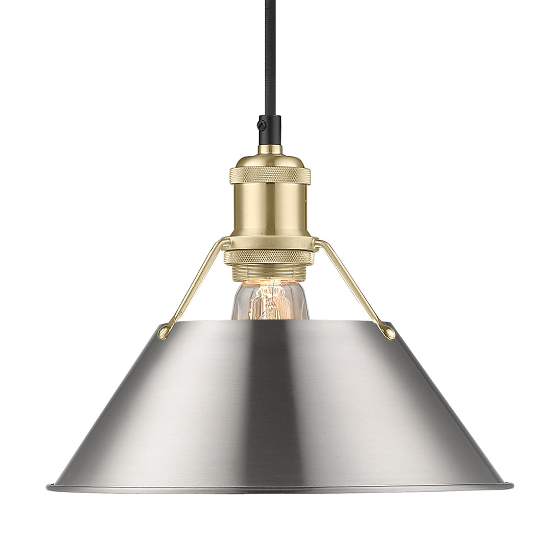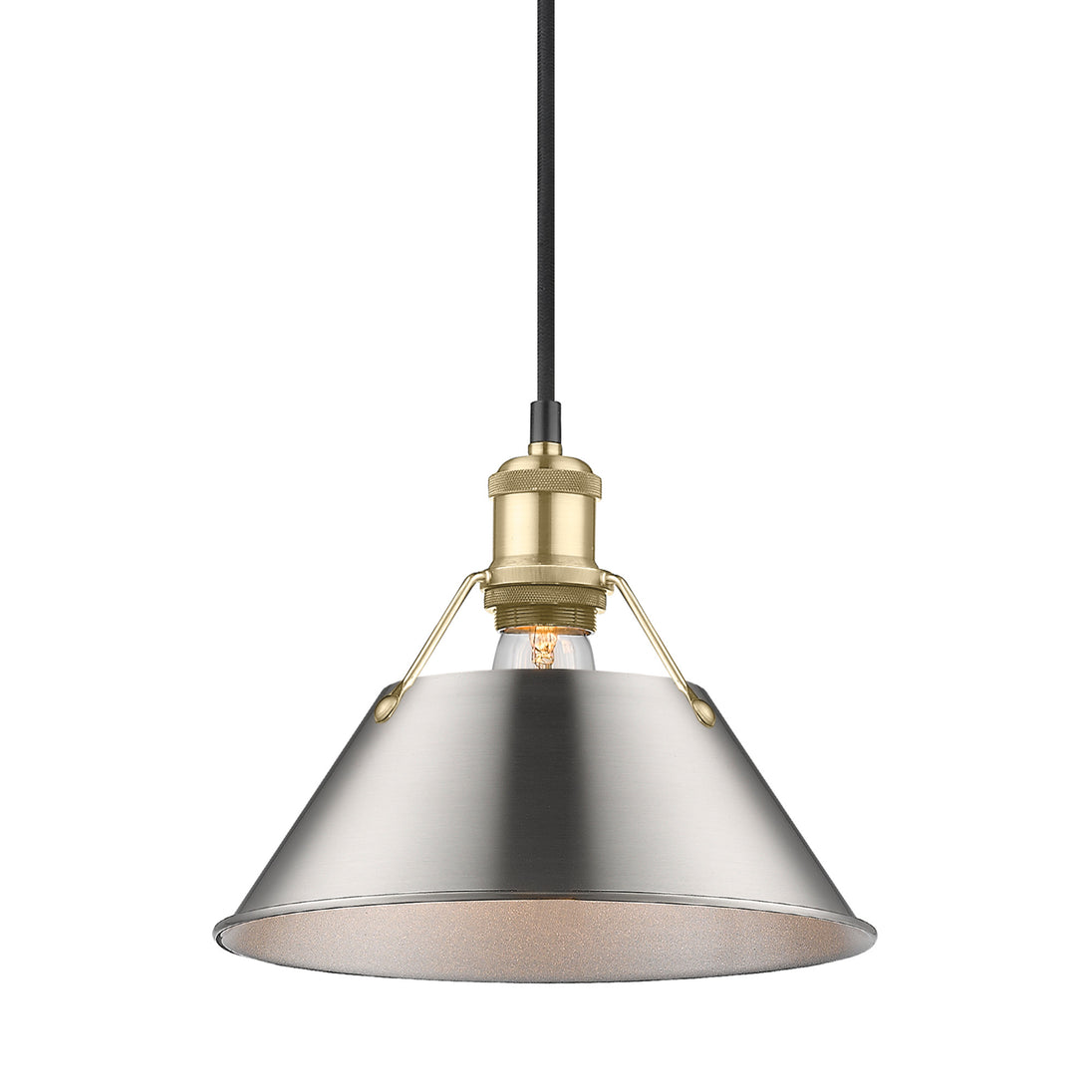 The Yep by Golden Lighting Orwell 1-light 10in Pendant combines industrial design with Brushed Champagne Brass and a pewter shade, creating a soft, ambient illumination that elevates kitchens, dining rooms, or bedrooms.