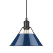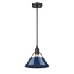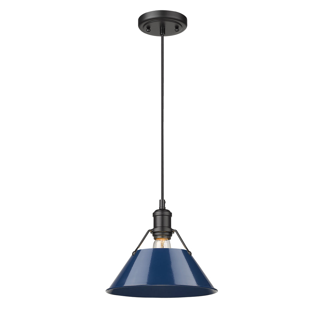 Bring vintage industrial elegance into your home with the Yep by Golden Lighting Orwell 1-light 10in Pendant. Featuring a Metal shade and a Matte Black frame, it creates a welcoming atmosphere. The metal shade in Navy Blue provides a bold and reflective finish that beautifully interacts with surrounding light. The epitome of clean, modern style, our Matte Black finish boasts timeless versatility and a smooth, non-reflective surface—suiting any decor. Ideal for kitchens, dining rooms, or bedrooms, this pendant is Damp Location Rated for covered areas with occasional moisture. Easily install it on angled ceilings, and customize the hanging length from 16" to 130". With dimensions of 10"W x 8.5"H x 10"D, it requires 1 E26 Medium base bulb (not included), max 100 wattage. Elevate your home with a striking design that represents quality and style.