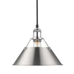 Bring industrial elegance into your home with the Yep by Golden Lighting Orwell 1-light 10in Pendant. Featuring a metal shade and a chrome frame, it creates a welcoming atmosphere throughout your space. The pewter top showcases a soft, classic finish that elegantly diffuses light, offering a sophisticated non-glare glow while adding a timeless appeal to your decor. Brilliant and timeless, the Polished Chrome finish provides a sleek, mirror-like surface that is both easy-to-clean and effortlessly versatile, fitting a wide range of decor styles. Perfect for a variety of spaces, the pendant is Damp Location Rated, making it suitable for bathrooms, covered porches, and laundry rooms. It is also sloped-ceiling compatible and features an adjustable height from 16" to 130". Overall Dimensions: 10"W x 8.5"H x 10"D. This pendant requires 1 E26 Medium base bulb (not included), with a maximum wattage of 100, ensuring an inviting ambiance. Enhance your space with quality and style that invites conversation and boosts your decor.