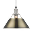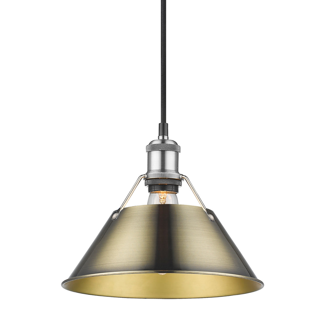 Bring vintage industrial elegance into your home with the Yep by Golden Lighting Orwell 1-light 10in Pendant. Featuring a metal shade and a pewter frame, it creates a welcoming atmosphere. This stylish metal shade has an Aged Brass electroplated finish that adds warmth and visual depth with its low-luster satin sheen, perfect for diffusing light beautifully. Our Pewter finish offers a classic alternative to brighter silver tones, with a soft grey hue that brings timeless charm to both classic and contemporary settings. Ideal for stylish illumination in kitchens, dining rooms, or bedrooms, this pendant is damp location rated, making it suitable for covered and semi-enclosed spaces like bathrooms and porches. The adjustable height feature allows for custom installation on sloped ceilings, easily set between 16" to 130". With overall dimensions of 10"W x 8.5"H x 10"D and requiring 1 E26 medium base bulb (not included, max 100 watts), this pendant light promises both functionality and aesthetic appeal, enhancing your living space with quality design.