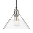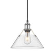 Bring industrial elegance into your home with the Yep by Golden Lighting Orwell 1-light 10in Pendant. Featuring a clear glass shade and a pewter frame, it creates a welcoming atmosphere. The clear glass shade allows for brilliant, unobstructed light, ensuring the design of both the bulb and fixture takes center stage. Our Pewter finish offers a soft and classic alternative to brighter silver tones, enhancing your decor with its understated and timeless appeal. Add a stylish statement to kitchens, dining rooms, or bedrooms — perfect for focused yet decorative illumination in entryways, foyers, and even bathrooms. Damp Location Rated for covered spaces and easily installable on angled ceilings with adjustable height, this fixture suits various settings. Overall Dimensions: 10"W x 8.5"H x 10"D. Requires 1 E26 Medium base bulb (not included), with a maximum wattage of 100. Elevate your space with quality craftsmanship and style.