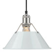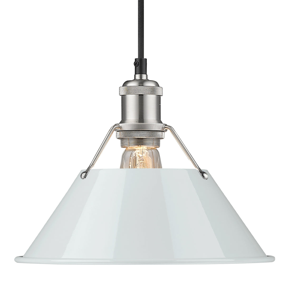 Bring industrial elegance into your home with the Yep by Golden Lighting Orwell 1-light 10in Pendant. Featuring a dusky blue metal shade and a pewter frame, it creates a welcoming atmosphere. The metal shade, finished in a serene dusky blue, adds a calming, vintage touch while maintaining a smooth surface with a high-gloss sheen that enhances light diffusion. Our Pewter finish offers a soft and classic alternative to brighter silver tones, enhancing your decor with its understated and timeless appeal. Add a stylish statement to kitchens, dining rooms, or bedrooms — perfect for focused yet decorative illumination in entryways, foyers, and even bathrooms. Damp Location Rated for covered spaces and easily installable on angled ceilings with adjustable height, this fixture suits various settings. Overall Dimensions: 10"W x 8.5"H x 10"D. Requires 1 E26 Medium base bulb (not included), with a maximum wattage of 100. Elevate your space with quality craftsmanship and style.