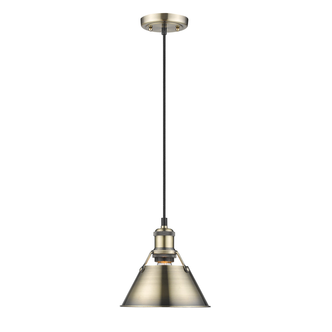 The Yep by Golden Lighting Orwell 1-light 8in Pendant combines industrial appeal with an aged brass finish and a metal shade, creating warm illumination that enhances kitchens and dining spaces.