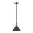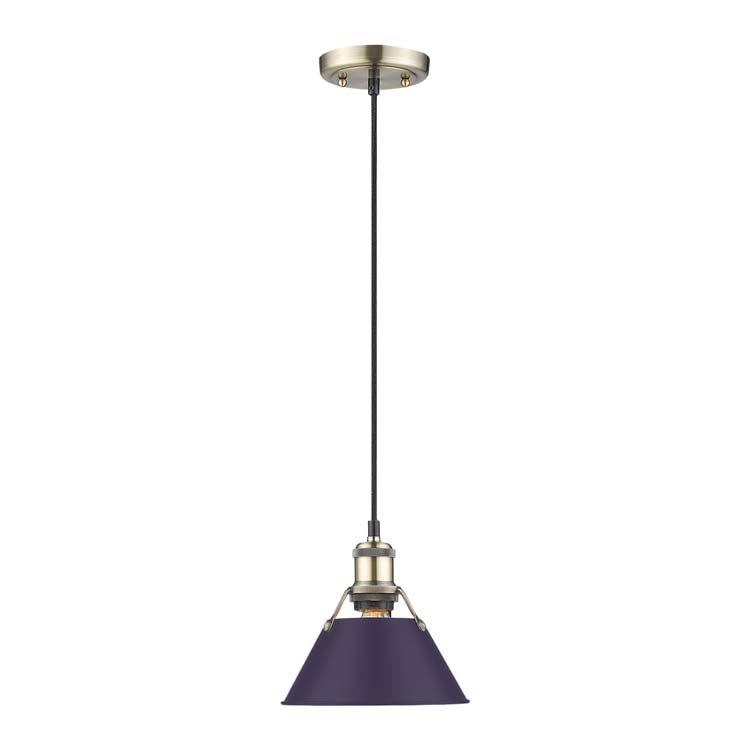 Bring industrial elegance into your home with the Yep by Golden Lighting Orwell 1-light 8in Pendant. Featuring a metal shade and an aged brass frame, it creates a welcoming atmosphere. \n\nThe exotic purple metal shade is smooth with a flat matte sheen, making a bold and luxurious statement. It beautifully absorbs light while enhancing color depth. \n\nEmbrace timeless beauty with the aged brass finish that offers a warm, inviting glow, reminiscent of vintage heirlooms. \n\nThis pendant light is perfect for kitchens, dining rooms, and bedrooms, and is damp rated for areas such as bathrooms and covered porches. It is also sloped-ceiling compatible and features adjustable height from 15" to 129", making installation a breeze. \n\nWith overall dimensions of 7.5"W x 7.5"H x 7.5"D and requiring 1 E26 medium base bulb (not included, max 100 wattage), it provides focused yet decorative illumination. \n\nClose your space with the quality and style of Yep by Golden Lighting, adding a touch of vintage industrial charm to your interiors.