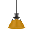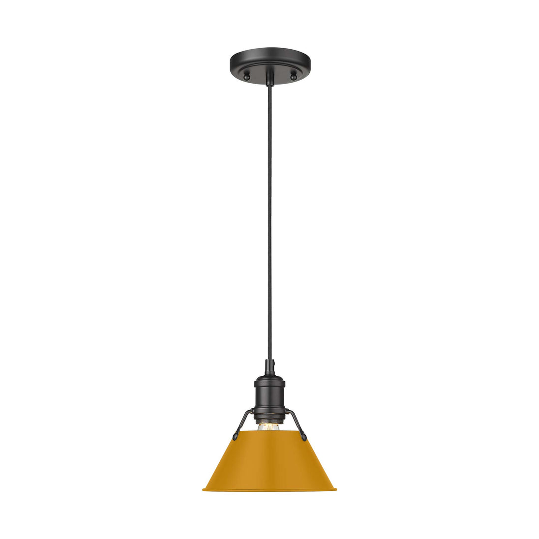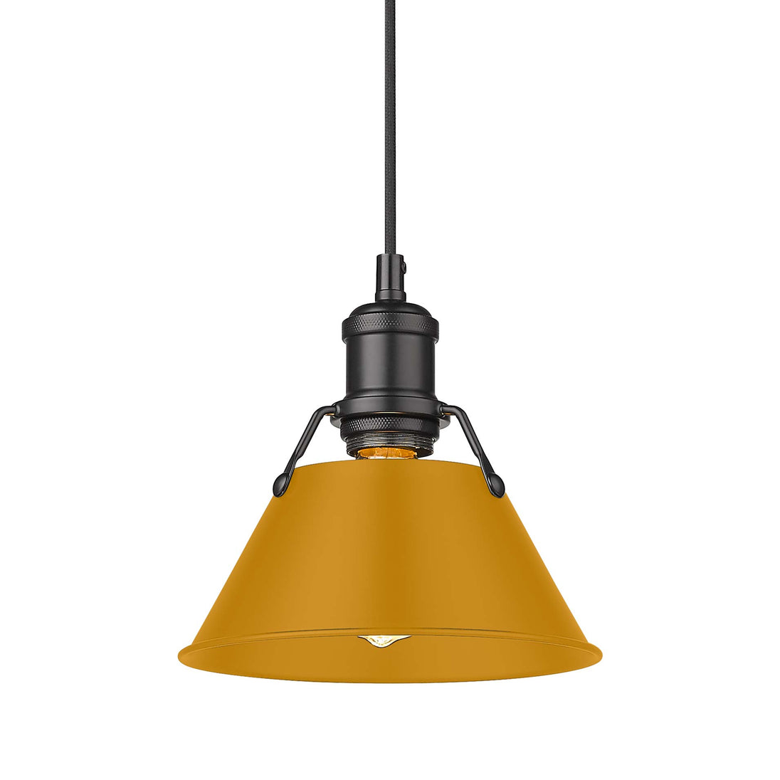 Bring industrial elegance into your home with the Yep by Golden Lighting Orwell 1-light 8in Pendant. Featuring a metal shade and a matte black frame, it creates a welcoming atmosphere. The metal shade showcases an Auric Yellow finish, featuring a deep, saturated golden-yellow color. With a smooth, non-reflective matte sheen, it exudes bold sophistication, adding a vibrant touch to your decor. The matte black finish is timeless and versatile, perfectly smooth to the touch, offering understated elegance that complements various modern styles. Suitable for kitchens, dining rooms, and bedrooms, this pendant is damp location rated, making it great for covered areas like porches and bathrooms. It’s also sloped-ceiling compatible and features an adjustable height from 15" to 129". Overall dimensions are 7.5"W x 7.5"H x 7.5"D and it requires one E26 Medium base bulb (not included) with a maximum wattage of 100. Transform your space with the Yep by Golden Lighting—a perfect blend of functionality and aesthetic appeal that will light up your life.