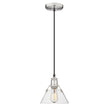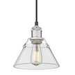 Bring industrial elegance into your home with the Yep by Golden Lighting Orwell 1-light 8in Pendant. Featuring a glass shade and a pewter frame, it creates a welcoming atmosphere. The clear glass shade offers brilliant, unobstructed light, showcasing the beauty of the bulb and fixture's design with its smooth, polished finish. Perfectly transparent, it complements a wide array of styles, enriching spaces with bright, clear illumination. Our pewter finish offers a soft and classic alternative to brighter silver tones, with a medium-grey hue that adds timeless appeal. The durable electroplating process and directional brushing provide a satin luster, diffusing light elegantly. This fixture is perfect for kitchens, dining rooms, or bedrooms, with a damp location rating making it suitable for covered or semi-enclosed spaces like bathrooms and porches. It's designed for easy installation on angled ceilings and features an adjustable height from 15" to 129". Overall dimensions are 7.5"W x 7.5"H x 7.5"D, and it requires one E26 medium base bulb (not included) with a maximum wattage of 100. Close your space with this stylish statement piece that blends vintage charm with modern functionality. Quality craftsmanship ensures you'll enjoy this fixture for years to come.