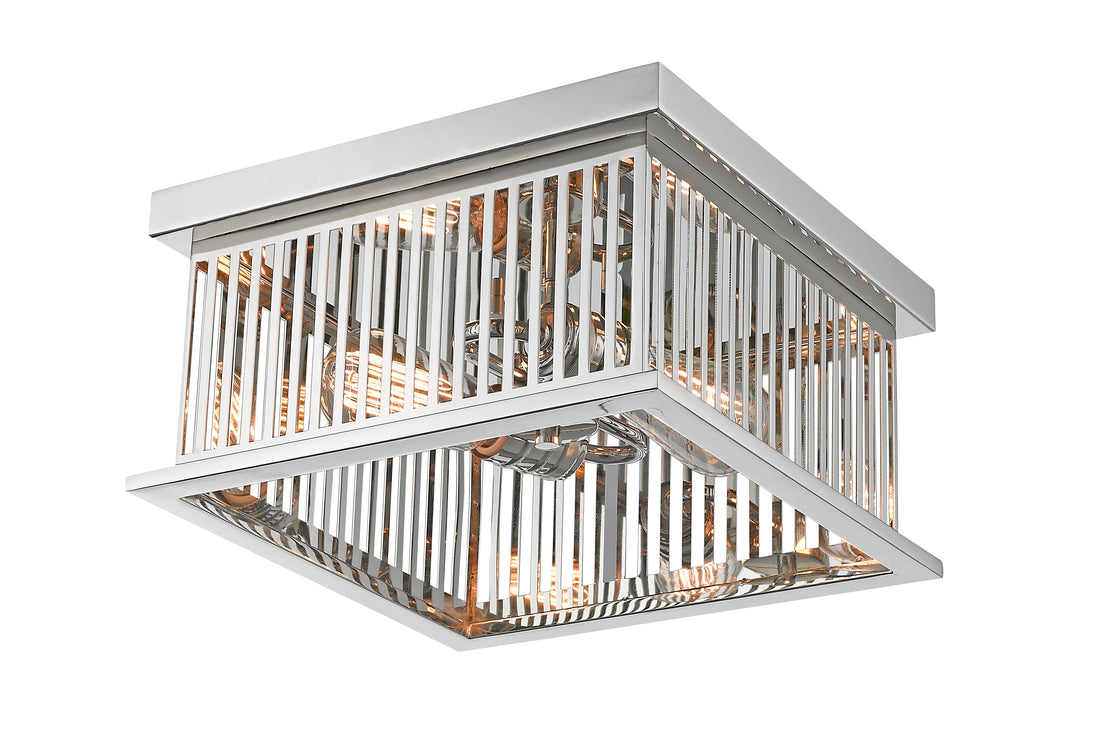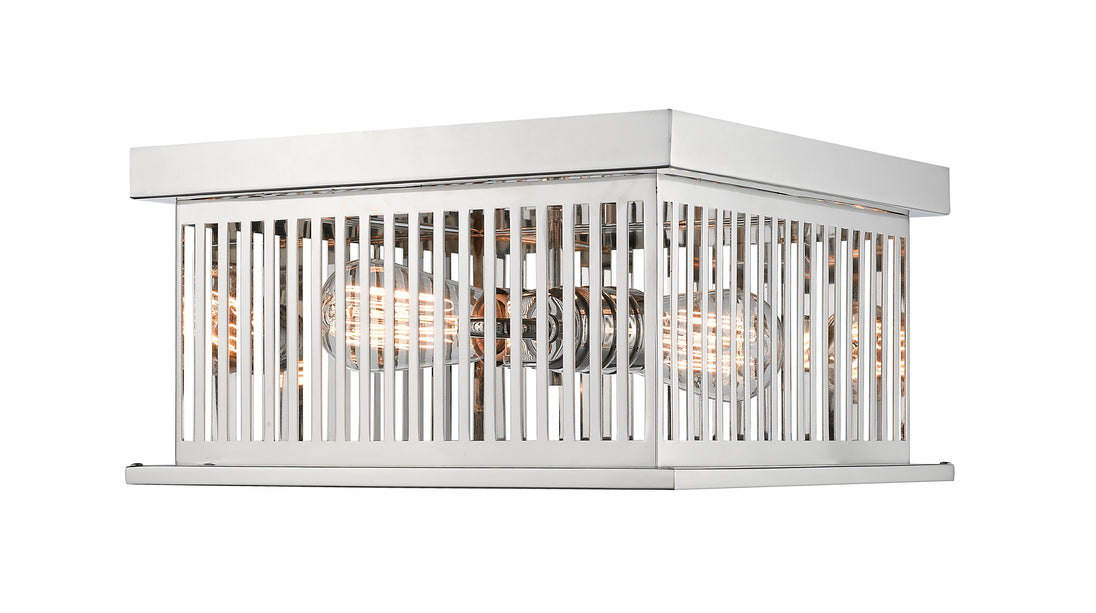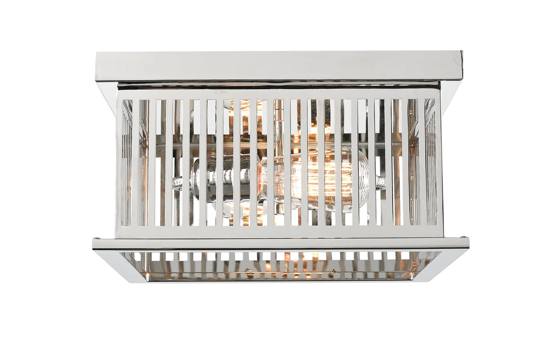 Embrace the industrial geometric flavor of this two-light flush mount ceiling light. Its polished nickel finish grill-inspired steel frame offers a fun and stylish contrast to a pair of vintage bulbs, making it an ideal choice for mixed room motifs.