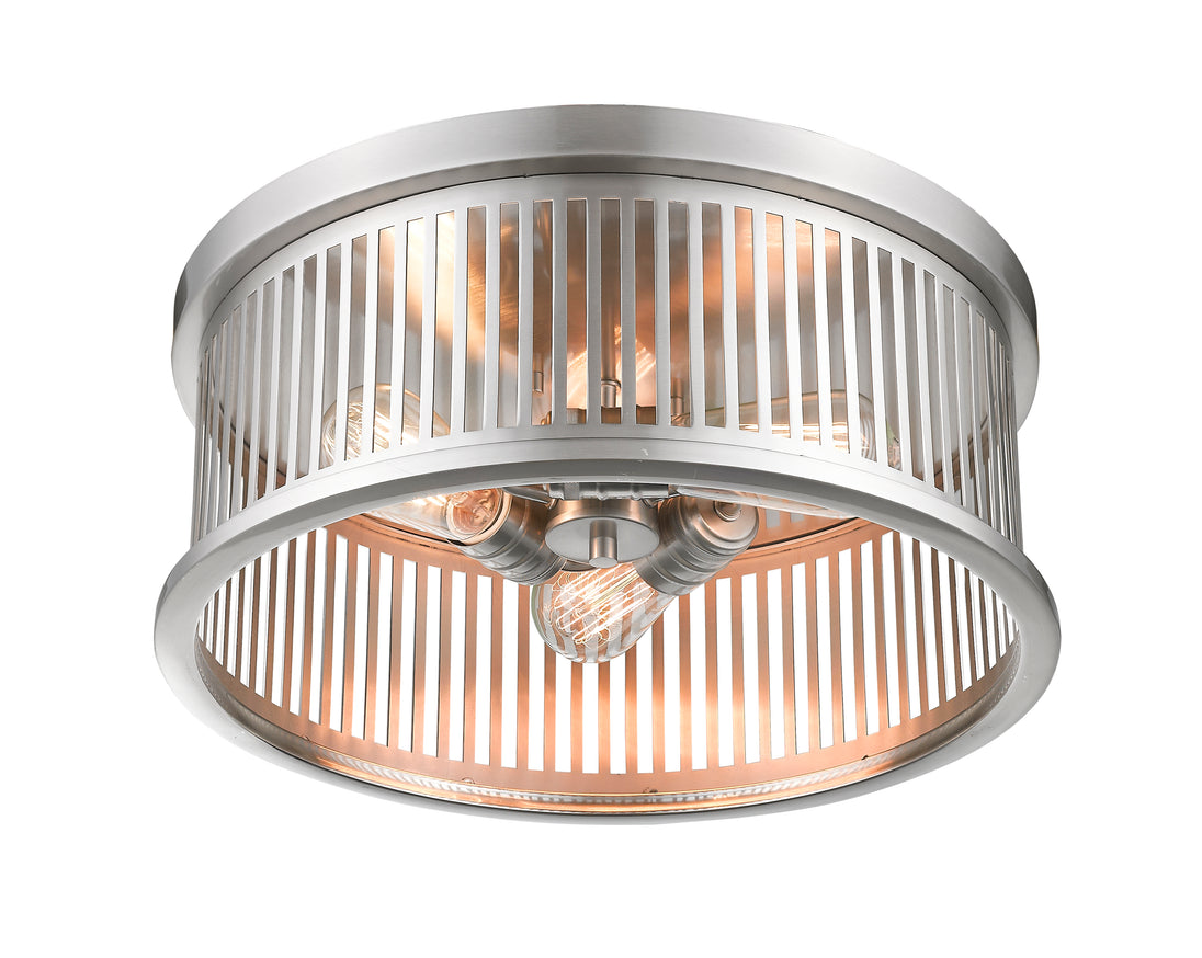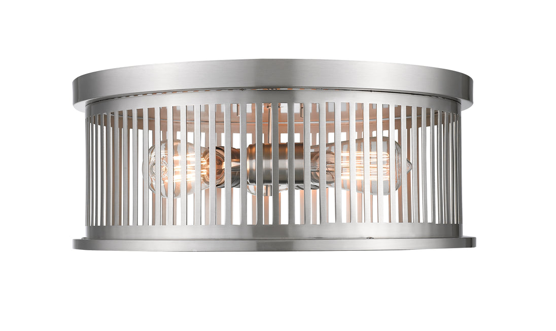 A trio of vintage bulbs nestle in a linear-inspired steel housing that makes up this exceptional fixture. Offering a decidedly industrial attitude, this three-light brushed nickel finish round flush mount ceiling fixture delivers a charming look.