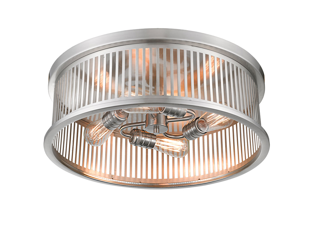 Embrace a modified cage motif in luscious brushed nickel finish steel, and add this four-light flush mount ceiling fixture to a modern space. With a decidedly industrial attitude, its vintage bulbs and linear styling create an urban feel that works in a custom design scheme.