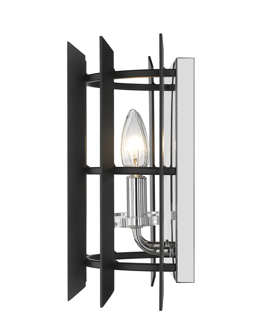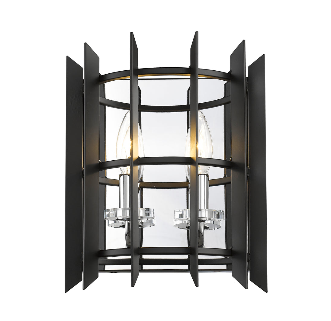Intriguing design detailing lends a compelling effect to this chrome and black matte steel two-light wall sconce. Enjoy a modern twist on a vintage historical theme, embellished with candelabra-style bulb mounts.