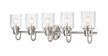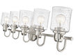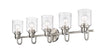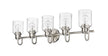 This four-light vanity fixture in matte black provides a playful way to include metropolitan style to your hallway, bathroom, or bedroom. The cylindrical shade with a seeded glass top is made of steel, offering an ambient glow.