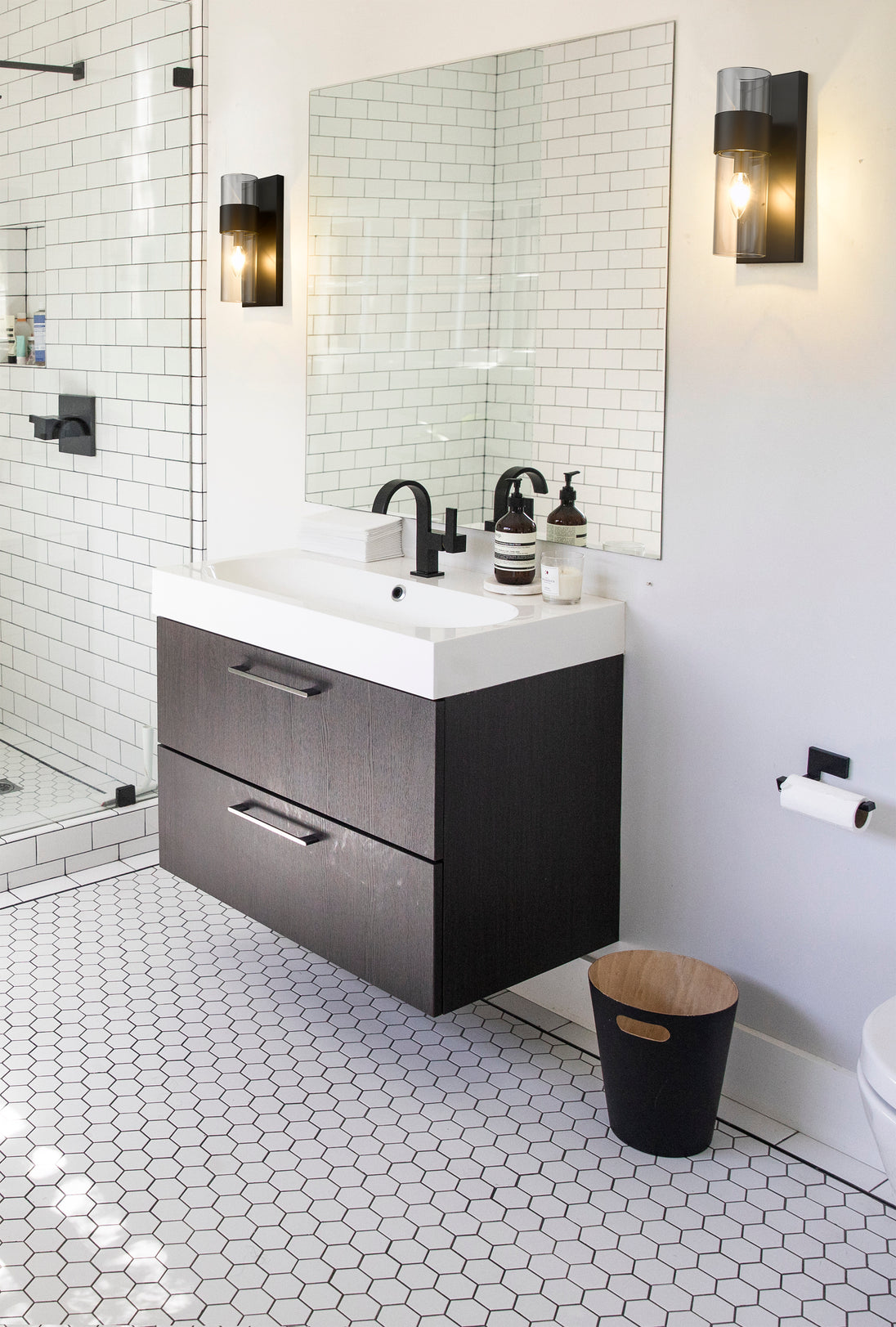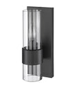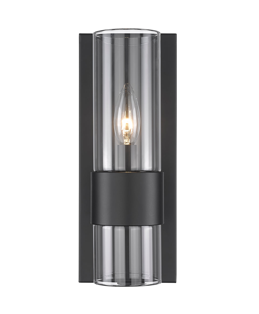 Sleek and minimal, this linear modern wall sconce illuminates a bathroom vanity or powder room with its understated sophistication. A steel plate holds a lantern-like clear glass tube that presents an exposed bulb, clasped by a wide matte black ring that gives a metallic touch and moody vibe, complementing bathroom hardware and fixtures. With its slender shape and design, this contemporary one-light wall sconce makes itself at home, flanked beside a mirror illuminating countertops and dressing areas.