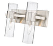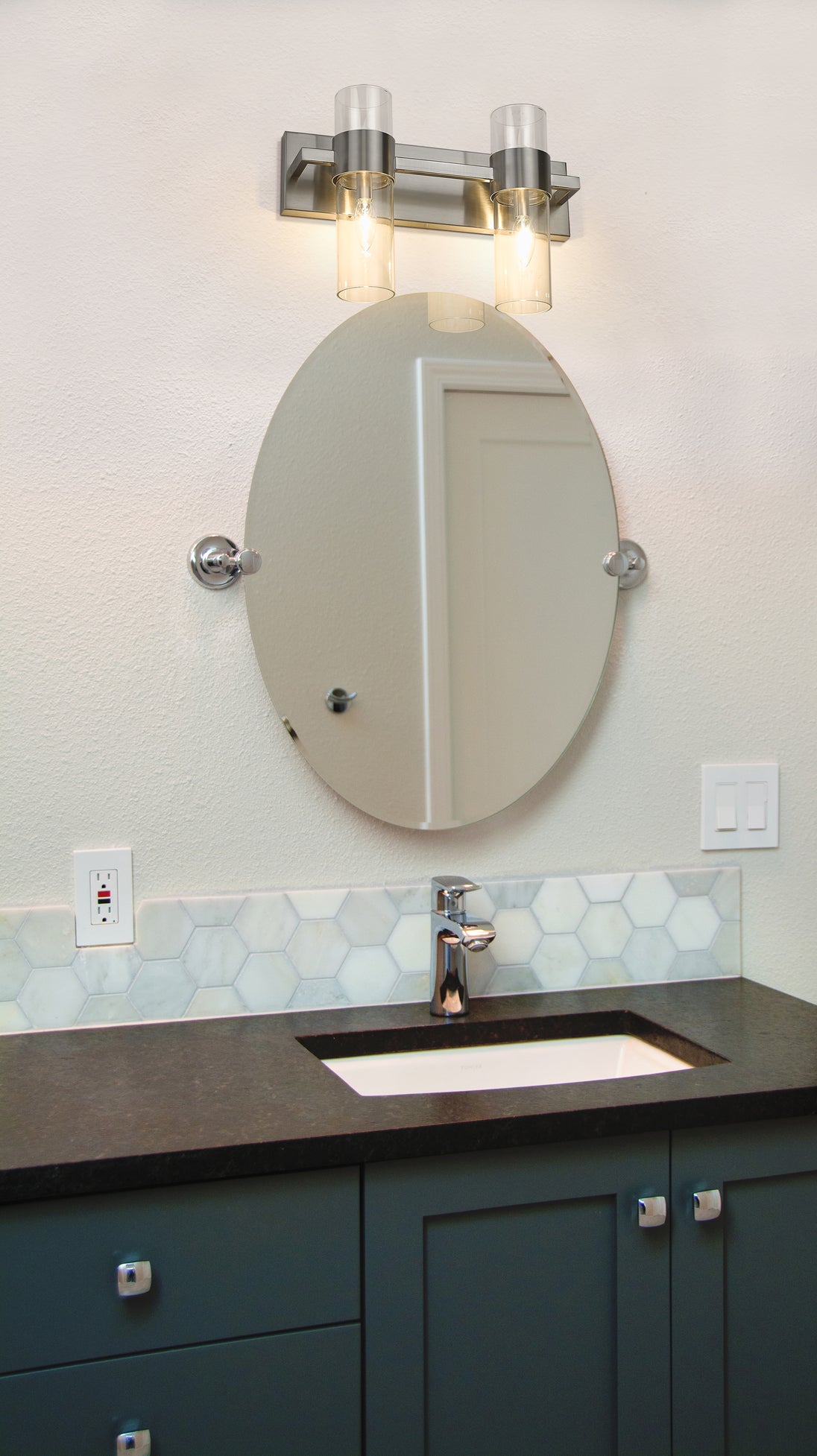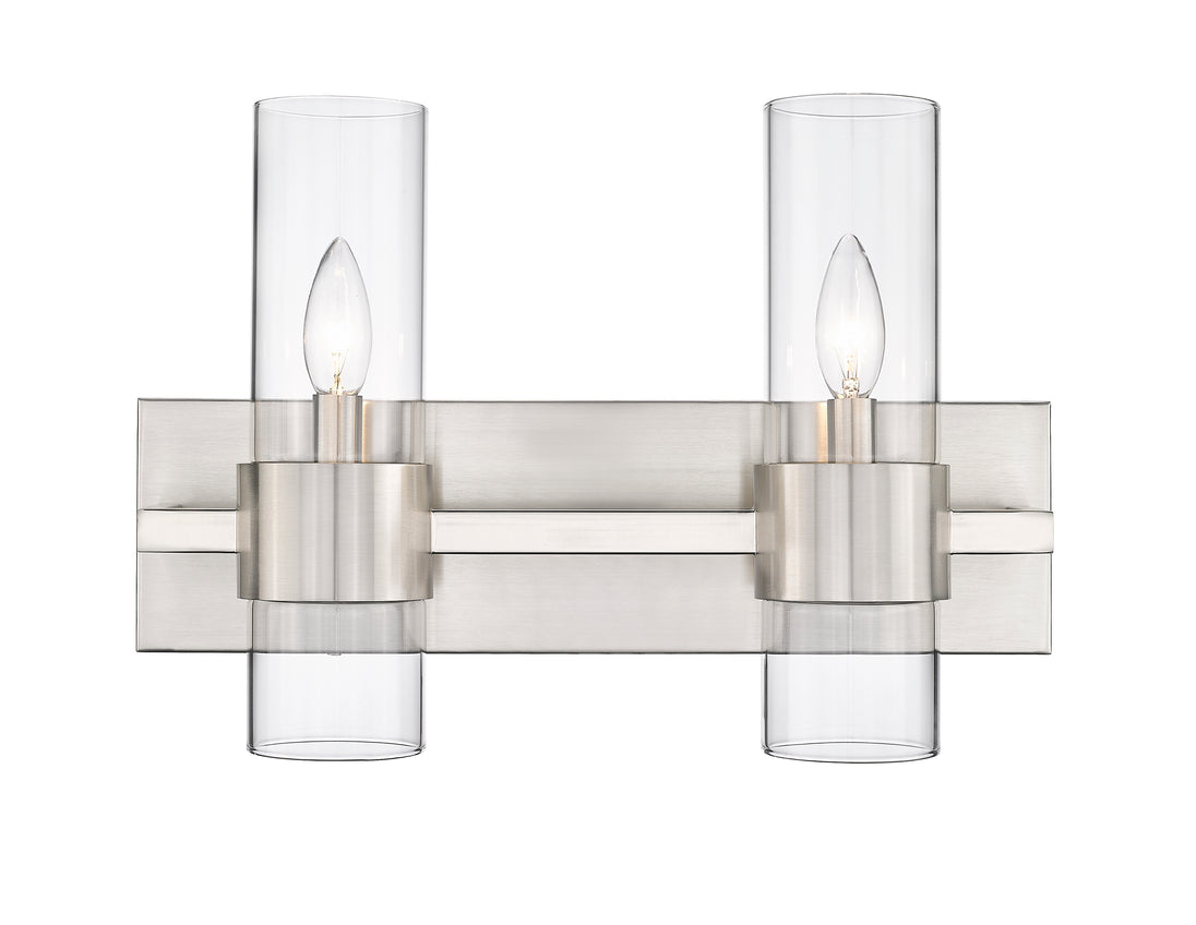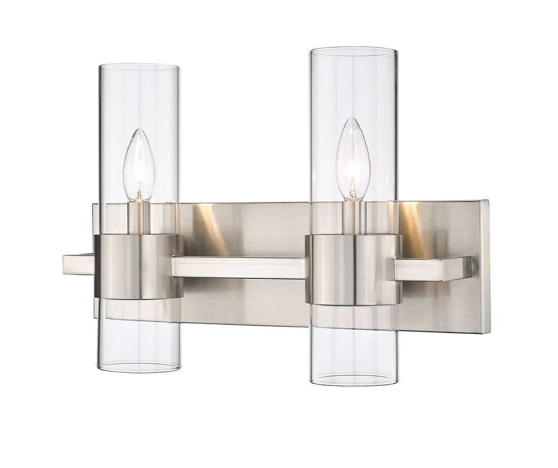 Sleek contemporary lines elevate this linear modern vanity light, illuminating bathroom countertops and powder room tablescapes with its minimalist flair. A long horizontal steel plate holds dual lights, each with a lantern-like clear glass cylinder shade clasped by a wide brushed nickel ring, designed to add a metallic touch or complement existing bathroom hardware and fixtures. This contemporary double vanity light makes a striking addition mounted over a decorative mirror, providing ample glow and chic style to the space.