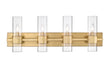 Create a chic minimalist expression with this linear contemporary vanity light, transforming en suite bathroom retreats into a tastefully adorned dressing area. This four-light vanity fixture presents an elongated steel plate in a warm rubbed brass finish that suspends four lantern-like clear glass cylinder shades held in place by a wide band in the same finish, creating a luxe metallic touch to a bathroom space. Match existing bathroom hardware and fixtures effortlessly and illuminate the space with this stunning and sophisticated modern vanity light, placing it over a spacious countertop or full-length wall mirror.