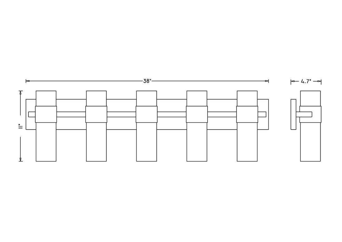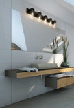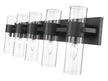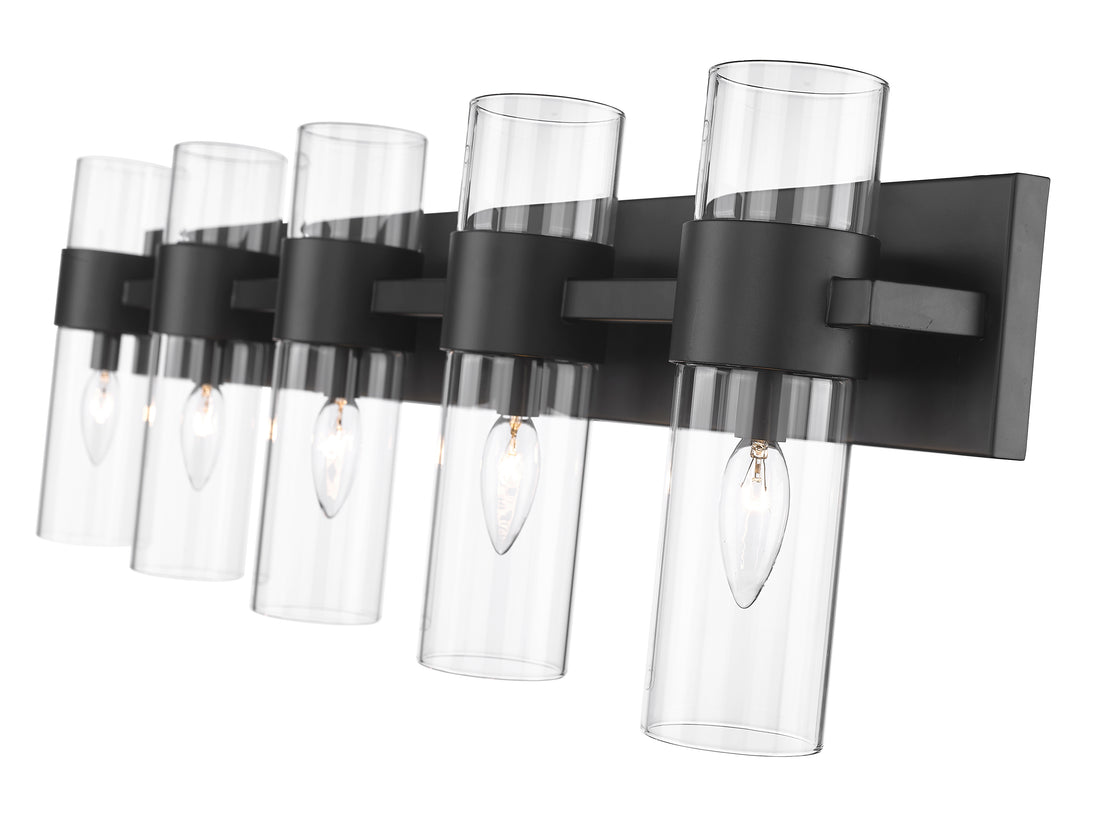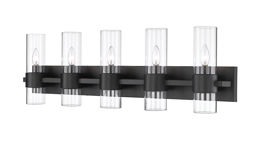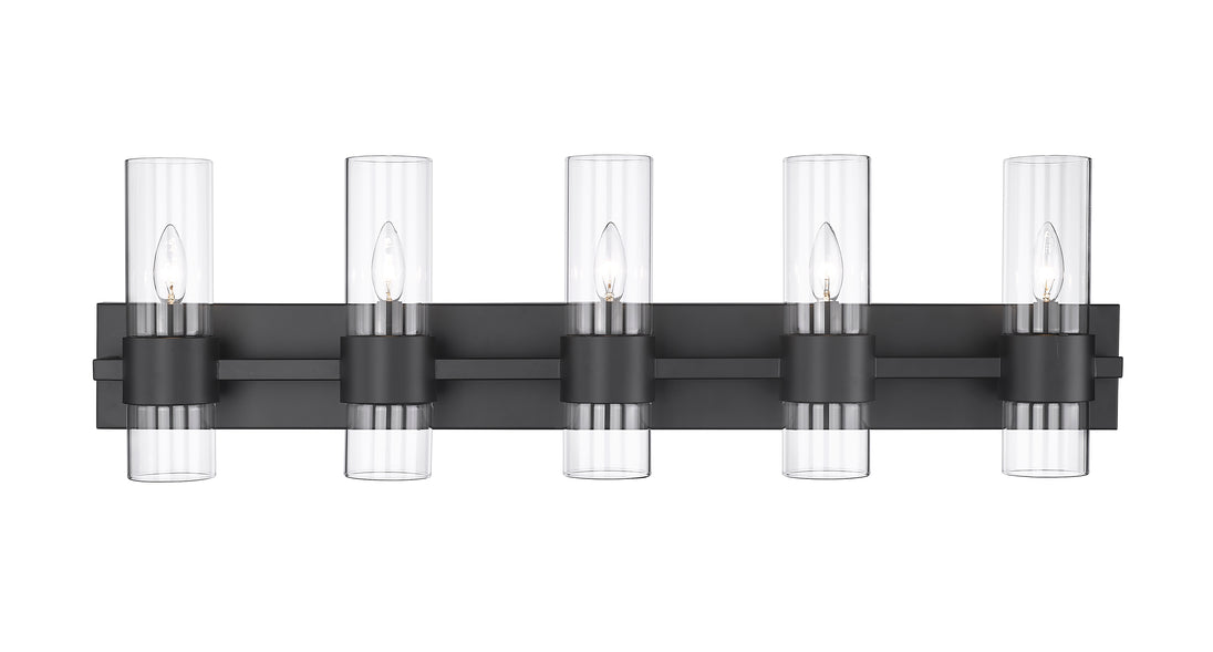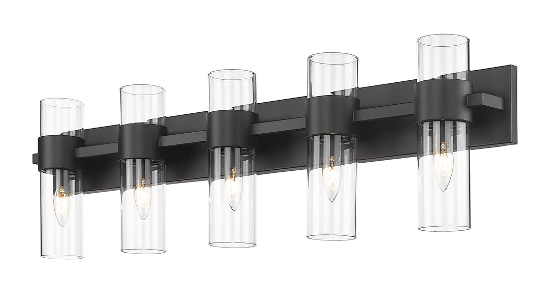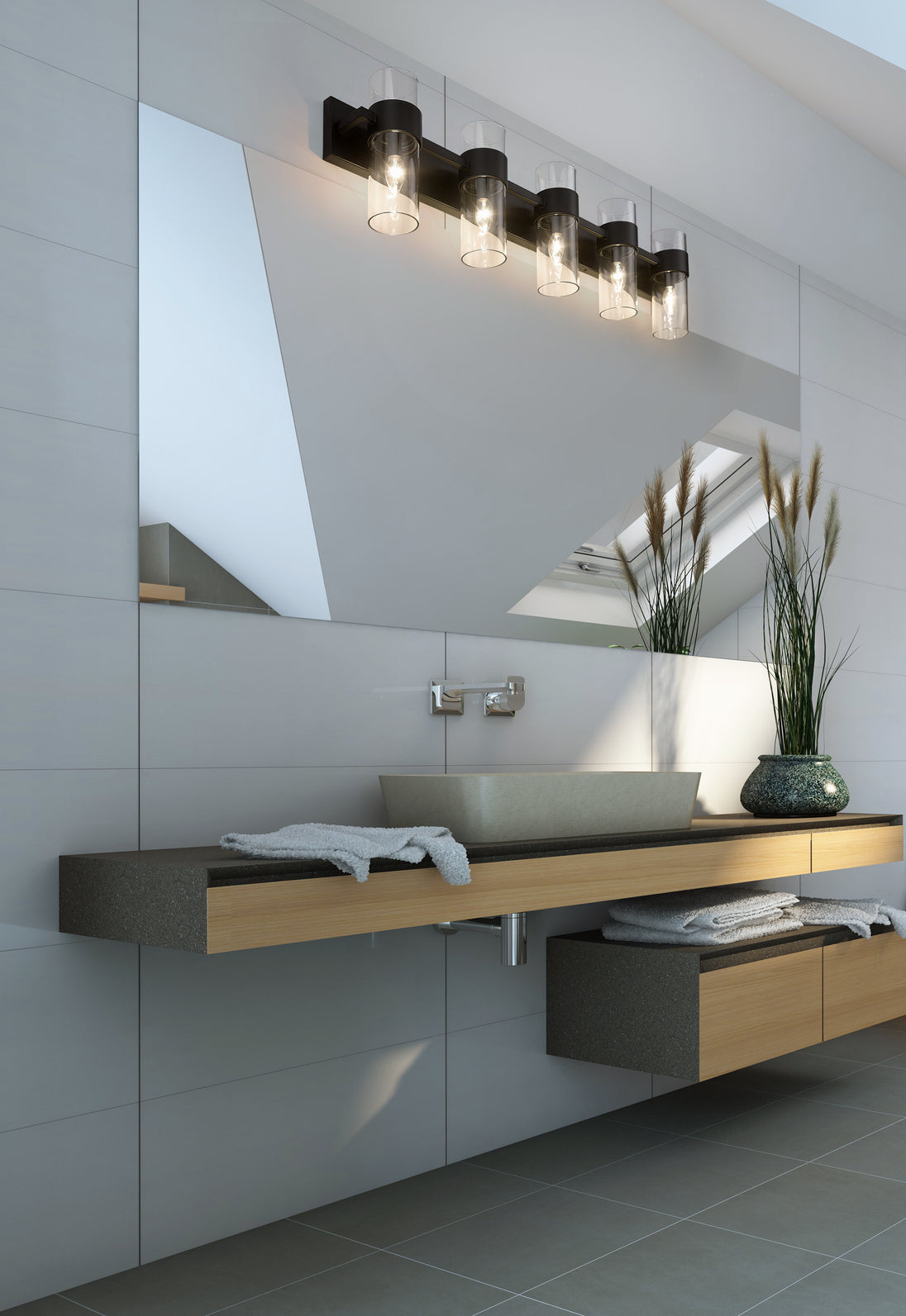 Create a minimalist vibe with this linear modern vanity light, elevating spacious master bathrooms into a serene clean space. This five-light vanity fixture boasts an elongated horizontal steel plate in a bold and dramatic matte black finish and holds five cylinder shape glass shades, suspended by a wide ring in a matching matte black finish. Offering a dark metallic tone to a bathroom interior, this contemporary five-light vanity illuminates the space with its sleek sophistication and lends a luxe touch as well.