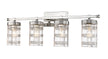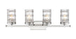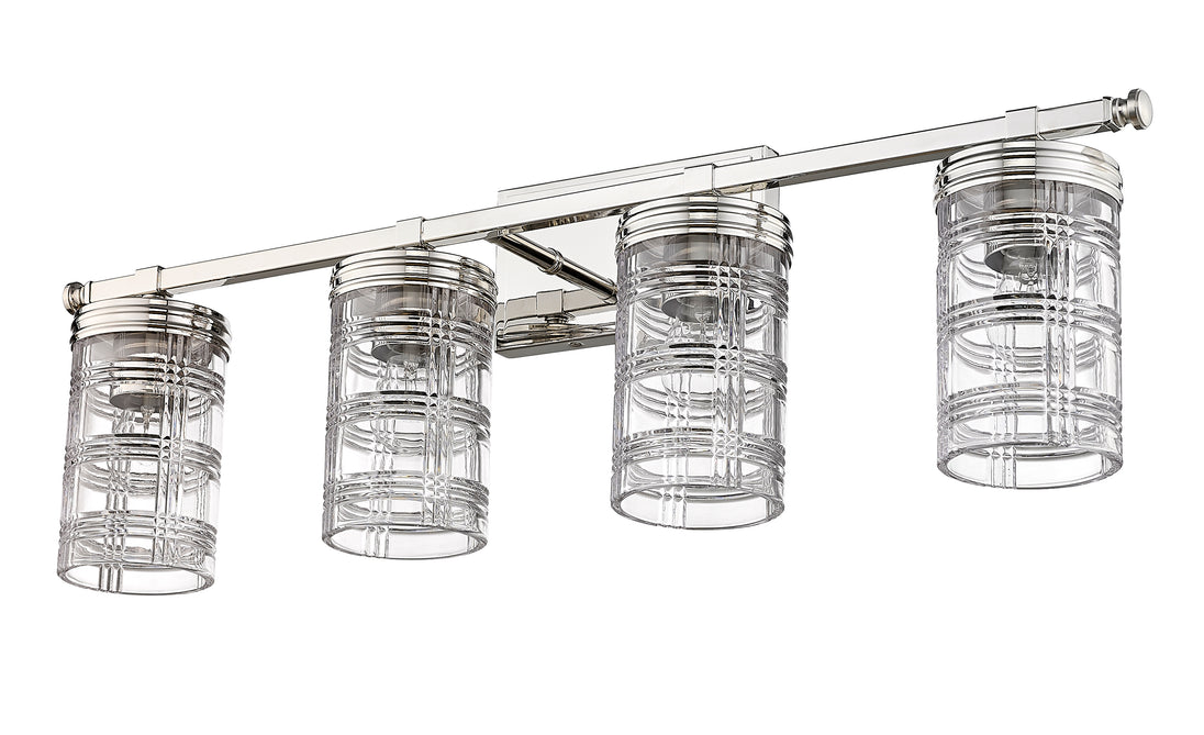 Create a classical-designed master bathroom with this sophisticated transitional four-light vanity wall sconce. Four cut crystal-inspired cylinder glass shades elevate vanities into an old-world restoration-inspired dressing area, elevated by a charming Glen plaid pattern around the glass that creates a glowing scintillation. A shiny polished nickel finish pushes the metropolitan glam feel to a bathroom interior, making this four-light vanity fixture a stunning addition to spacious vanities and tablescapes.
