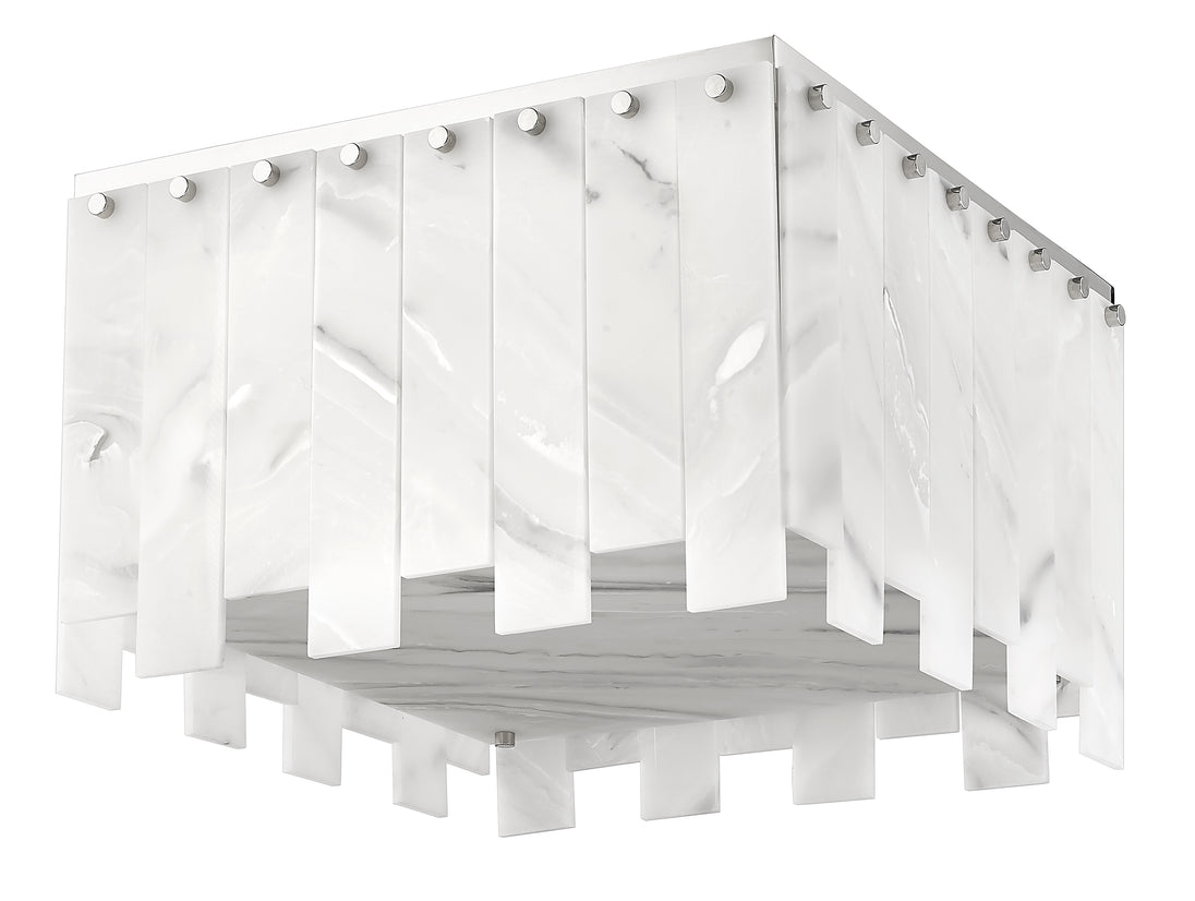 A bit of glam style goes a long way in both lighting and aesthetics. This six-light flush mount ceiling light from the Viviana collection creates impact with alabaster-like strips alternating in length and arranged around a rectangular polished nickel finish steel frame. Dressed up with whimsical rivot detailing, this flush mount light goes with the flow as it complements a gritty rendition of toned-down glam in a kitchen or entryway.